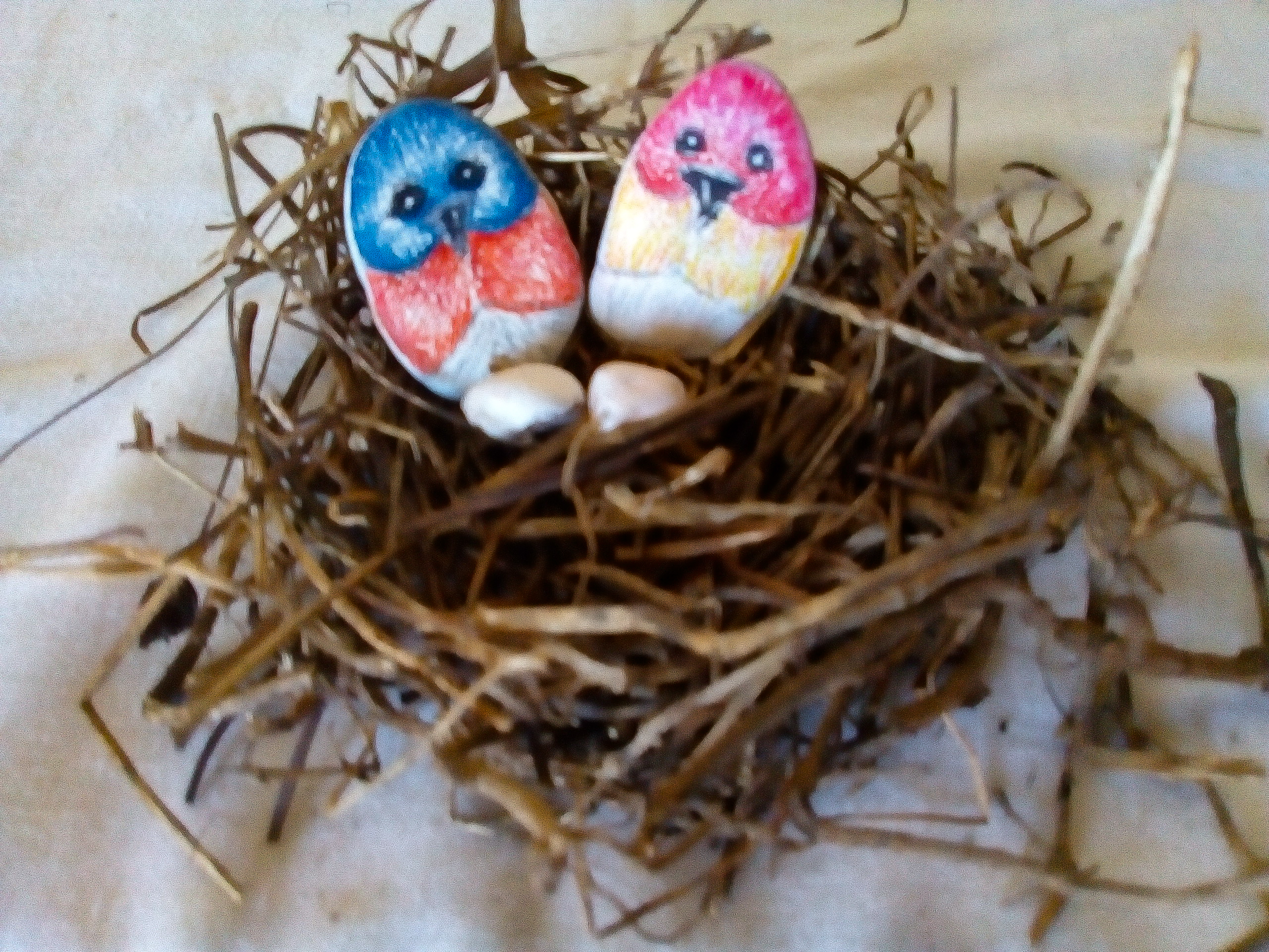 - Painting the details of the birds was very difficult since the brush was something big haha, for the male bird I used colors with a very fine tip, and for the female if I used the brush with pink paint, the eyes were made with permanent black marker: