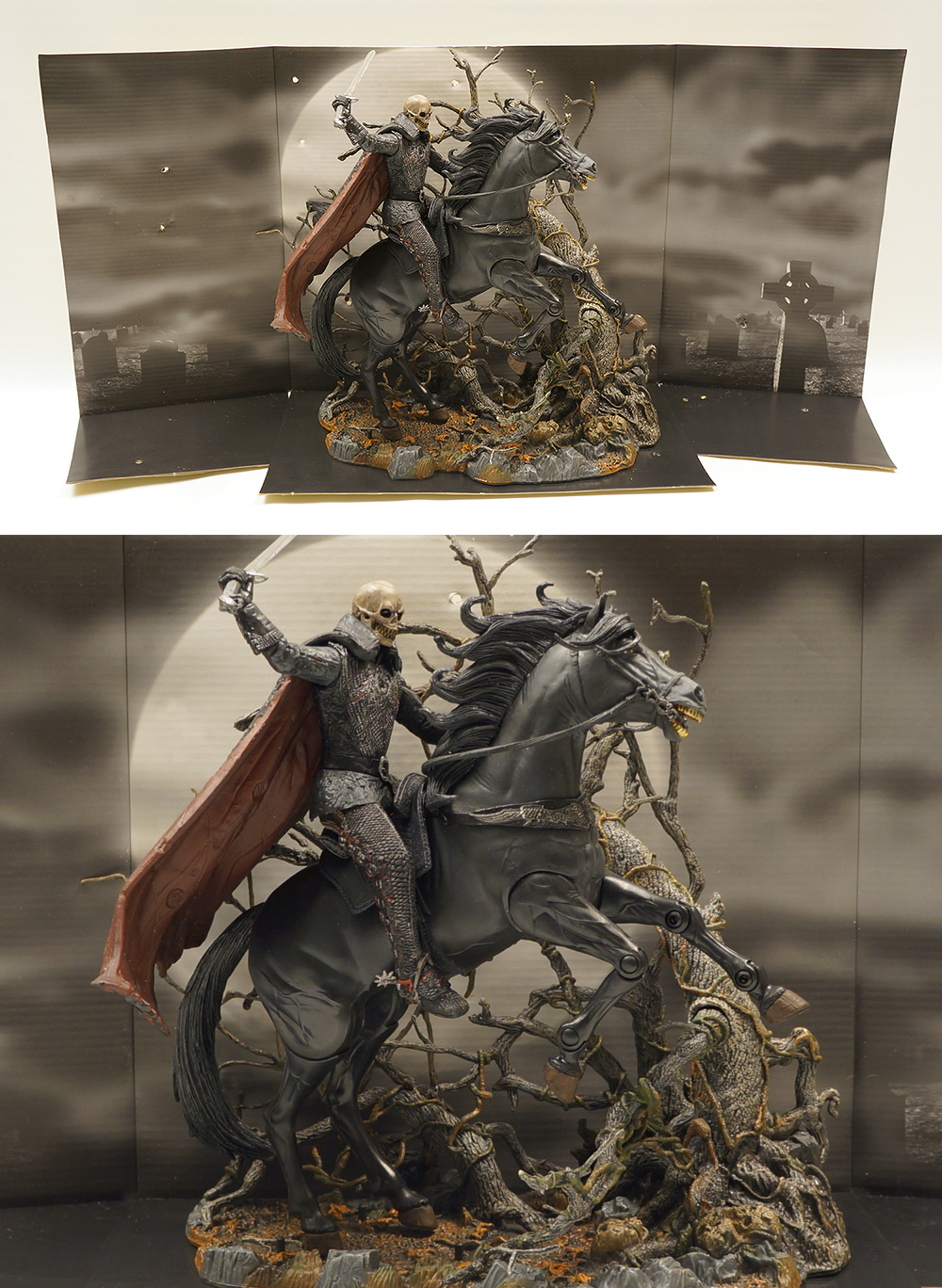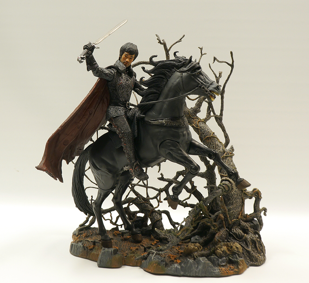 실물의 박력과 존재감이 사진에 다 안 담기네요.ㅎㅎ 장식효과는 가히 최고입니다. 흑마 뒷다리 고관절이 나름 빡빡해서 다른 지지없이 뒷다리 고정만으로 저 자세를 유지할 수 있습니다. 헐렁해 지지 않도록 이상태로 잘 두어야 겠습니다. 패키지 내부에 있던 속지를 활용하면 이렇게 밤배경도 연출할 수 있습니다.