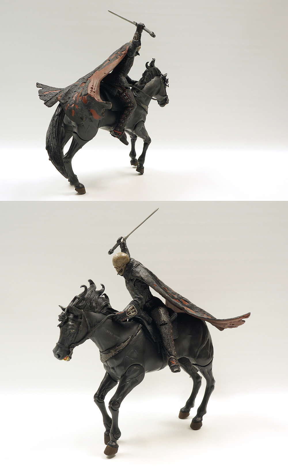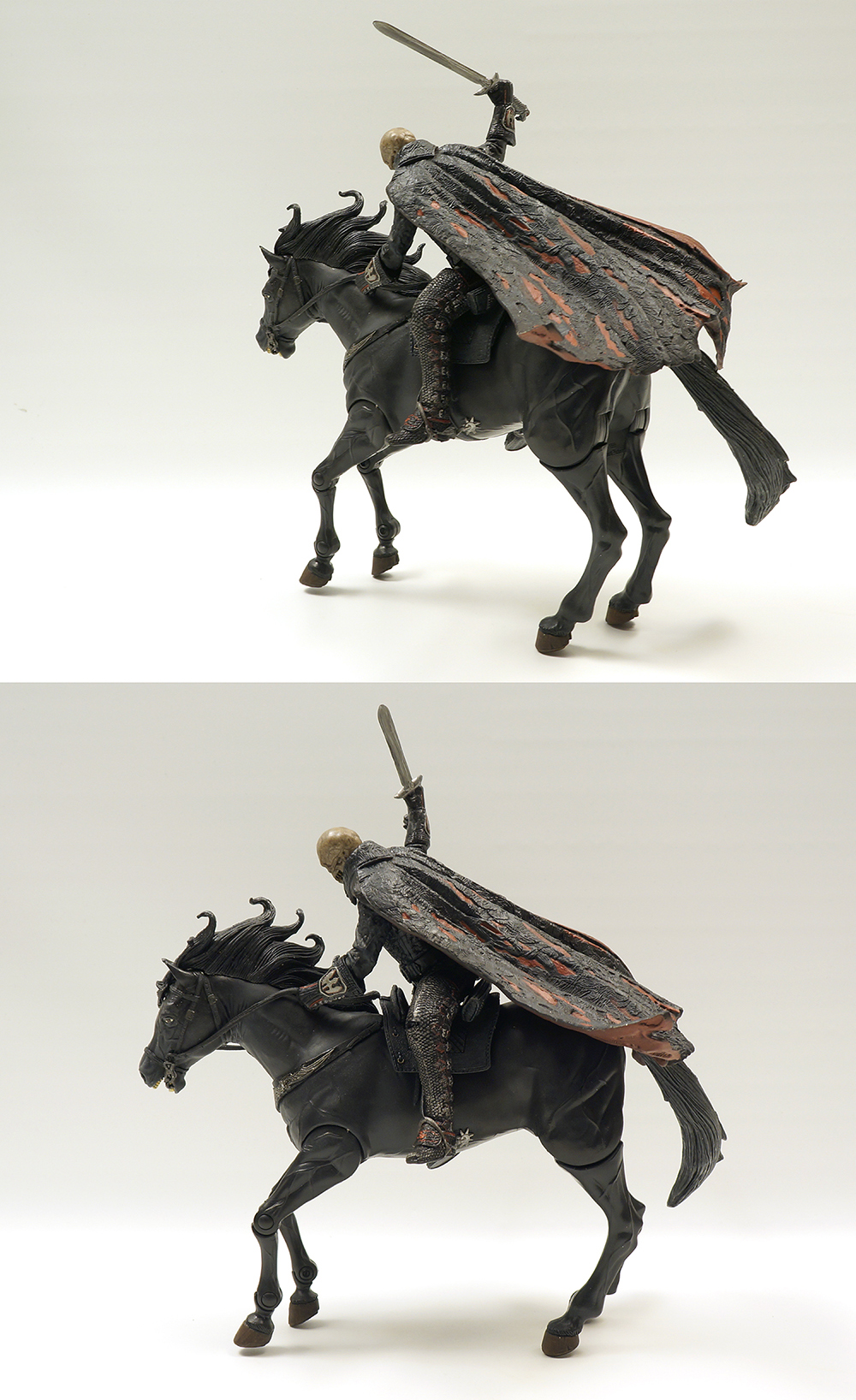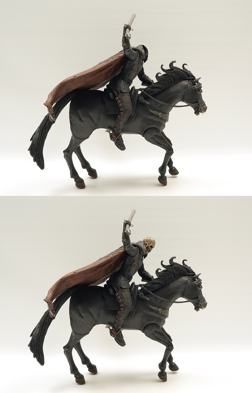 흑마는 다리에 노출된 관절만큼 구동이 되며 헤드부분 전체와 꼬리는 아주 부드러운 연질로 덮여있습니다. 호스맨도 노멀과 다르게 다리부분은 신발, 박차까지 모두 연질의 고무로 덮여있네요. (노멀은 망토부분만 연질입니다.) 말위에 앉는 자세와 자립하는 자세를 모두 연출하기 위한 조치인 것 같습니다. 등자에서 부츠를 빼고 말에서 내려 자립시킨 후 다시 또 자세잡기가 두려워서 그냥 두었습니다. 노멀 몸체와 디테일 부분에서도 살짝 차이가 납니다. 흑마의 퀄도 이빨이 좀 누렇지만 상당히 만족스럽습니다.