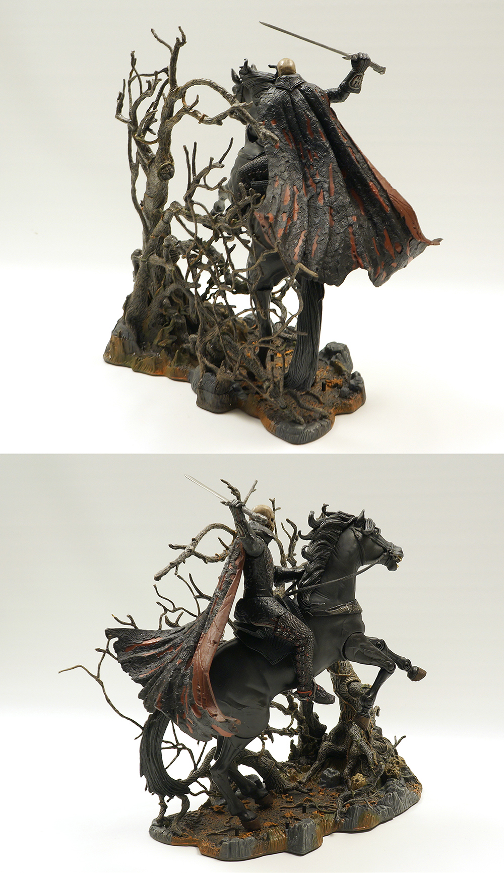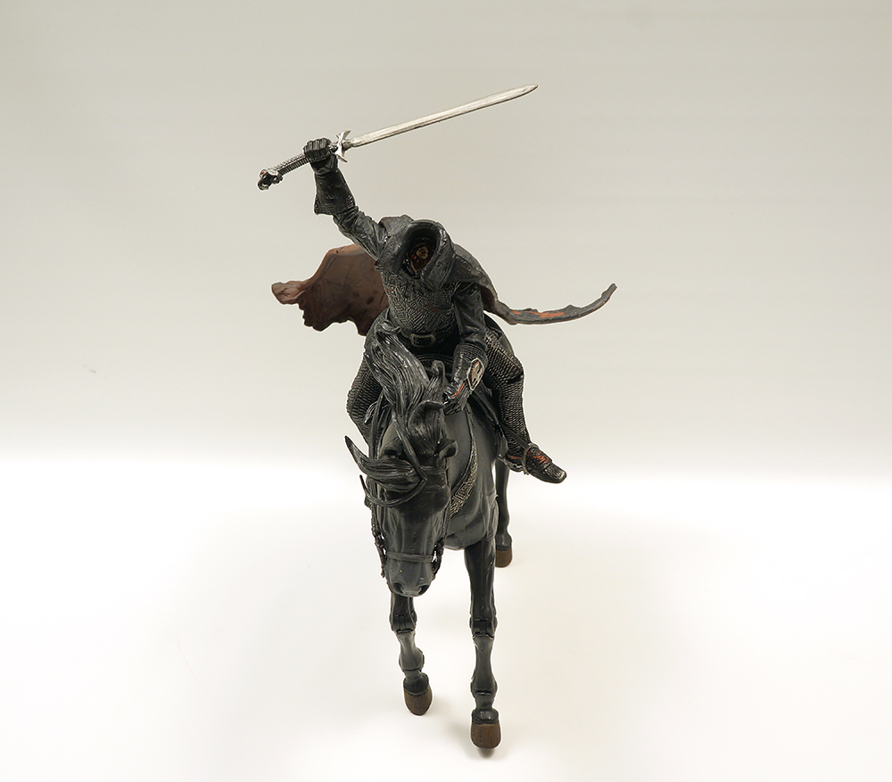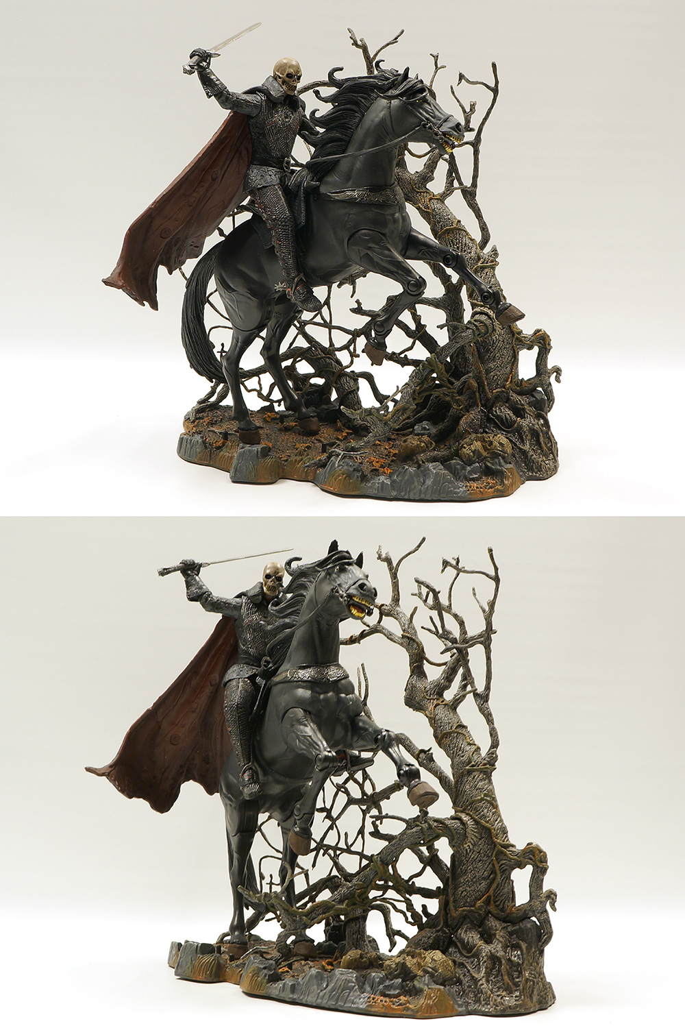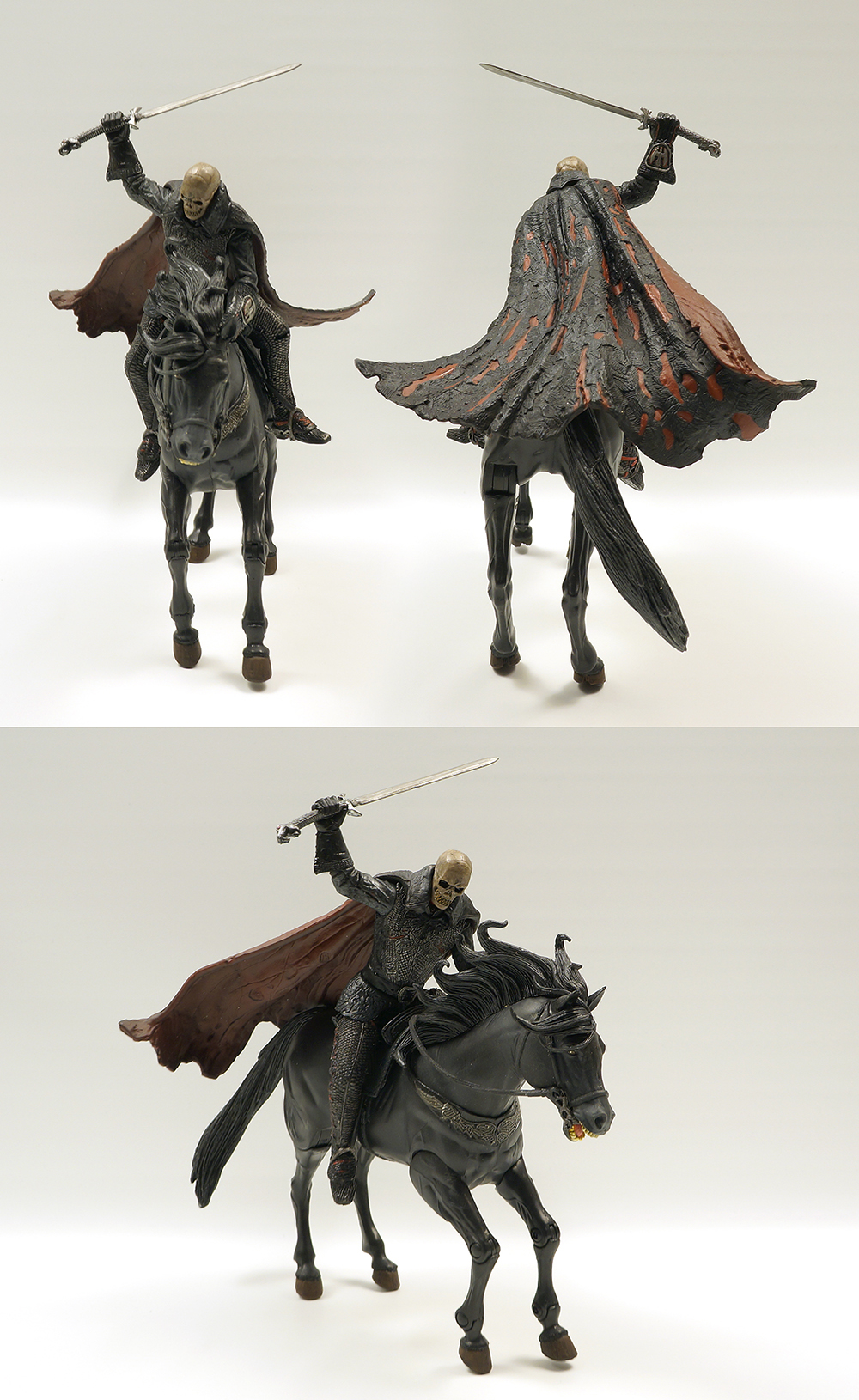 흑마는 다리에 노출된 관절만큼 구동이 되며 헤드부분 전체와 꼬리는 아주 부드러운 연질로 덮여있습니다. 호스맨도 노멀과 다르게 다리부분은 신발, 박차까지 모두 연질의 고무로 덮여있네요. (노멀은 망토부분만 연질입니다.) 말위에 앉는 자세와 자립하는 자세를 모두 연출하기 위한 조치인 것 같습니다. 등자에서 부츠를 빼고 말에서 내려 자립시킨 후 다시 또 자세잡기가 두려워서 그냥 두었습니다. 노멀 몸체와 디테일 부분에서도 살짝 차이가 납니다. 흑마의 퀄도 이빨이 좀 누렇지만 상당히 만족스럽습니다.