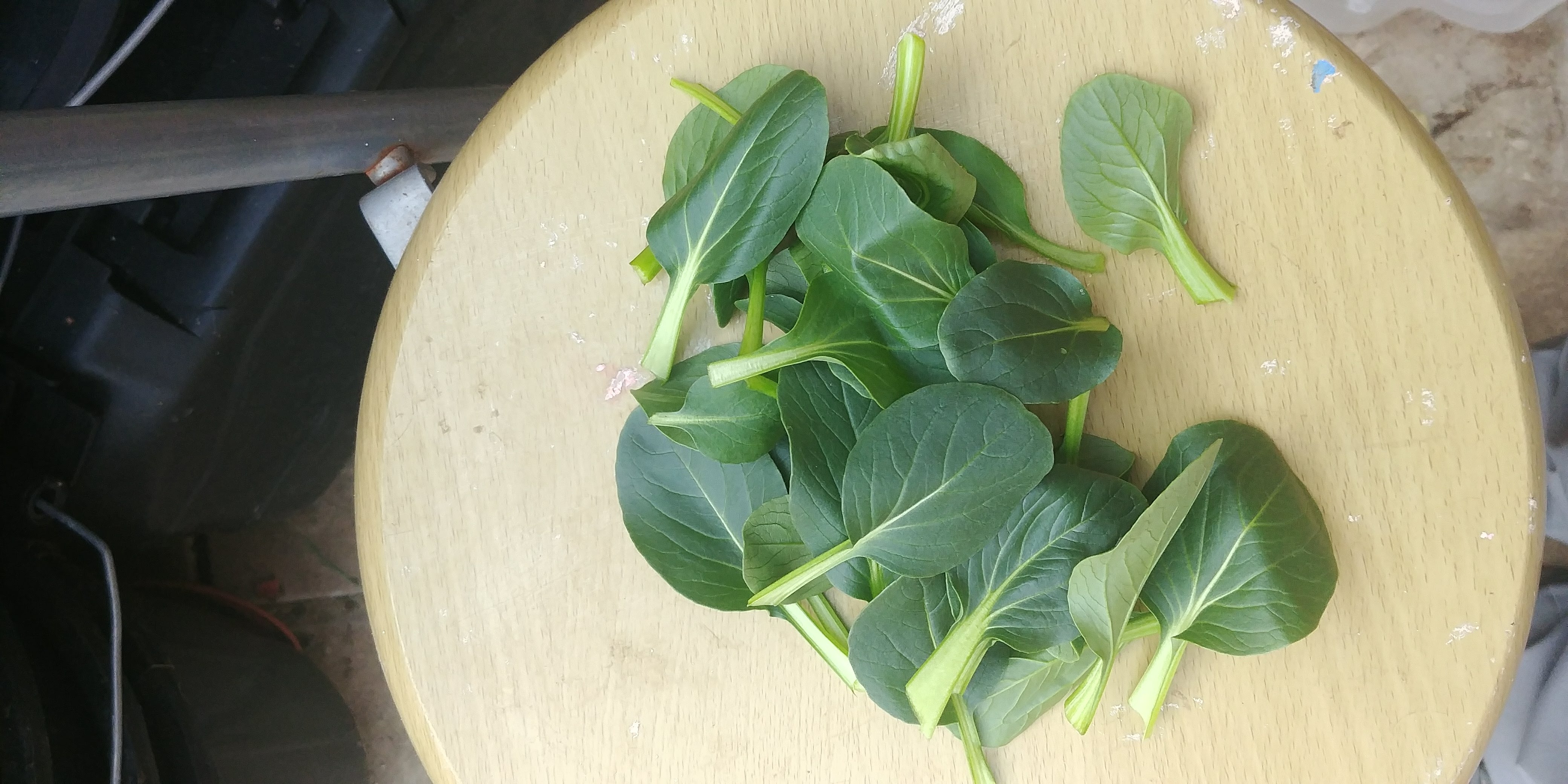 I've got the first tiny harvest of this year as well. Some packchoy leaves, just enough for a salad.