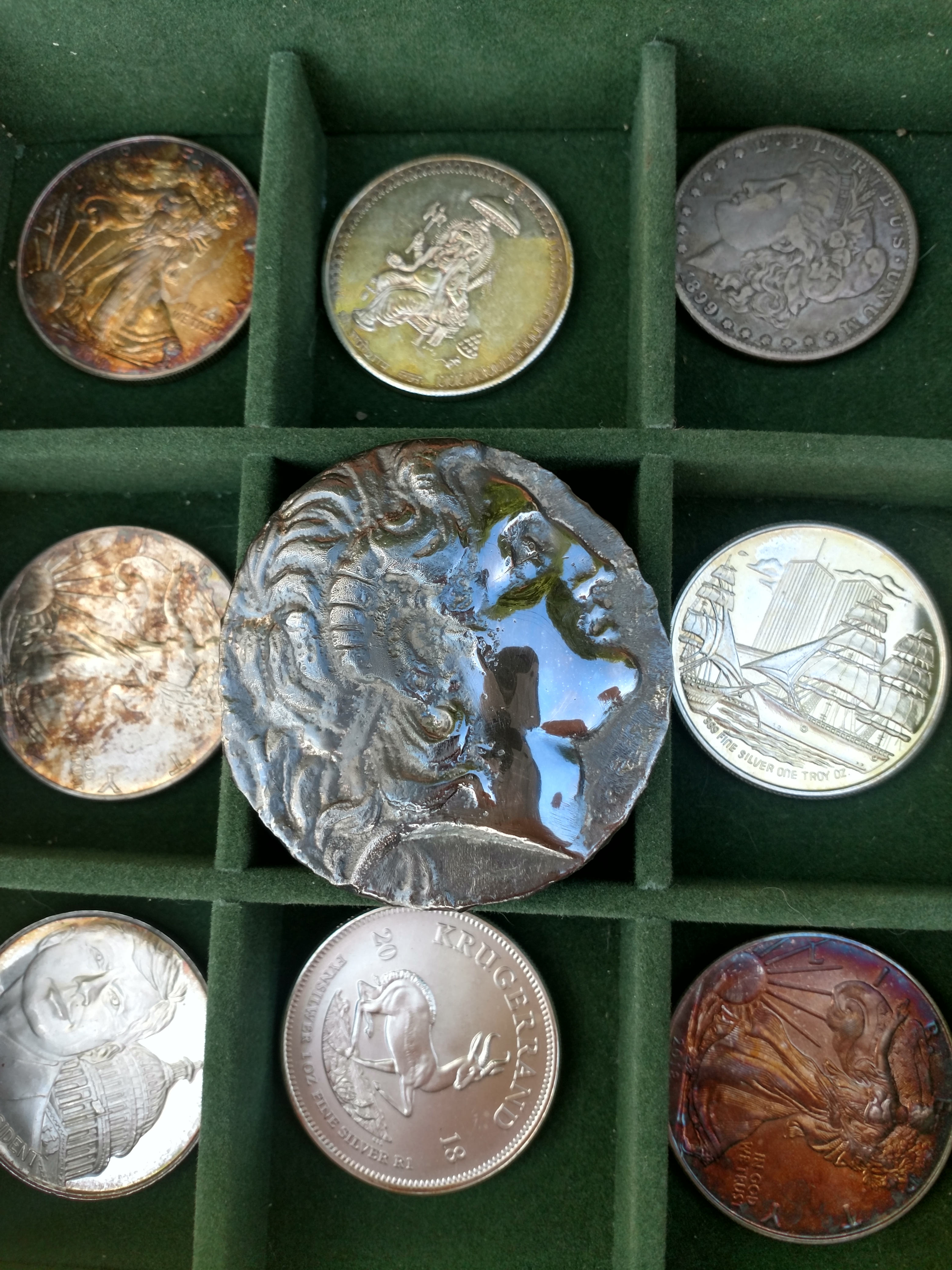Ok so check out the coin on the right middle. It's just a silver round in true silver color. Now look at the Alexander. Amazing pic to show the contrast between the Alexander and a bullion coin. The gunmetal is absolutely beautiful. I have 2 of these numbered 6 and 7. I'm waiting for my stamp to come from this company stampyours in Ohio. Their pricing was great and customer service was the best I've experienced in a long time.