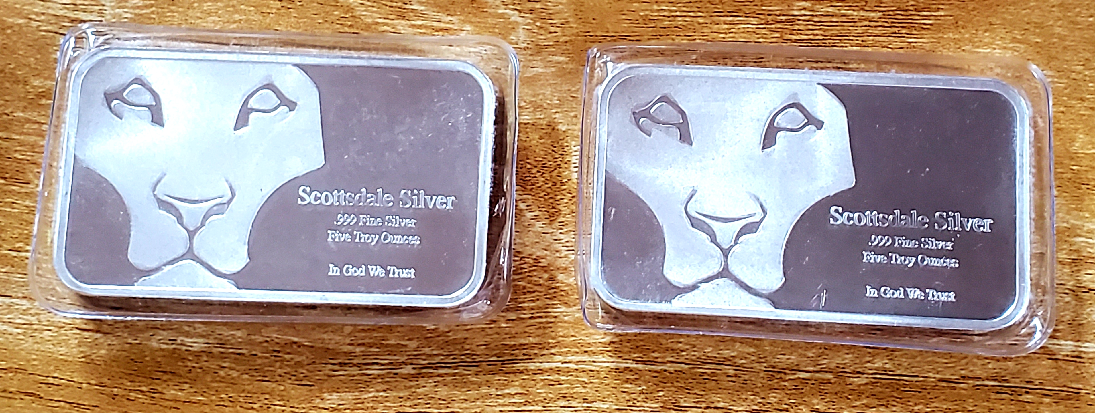 These are 5oz Scottsdale Prey Silver Bars. Scottsdale lion logo at the front