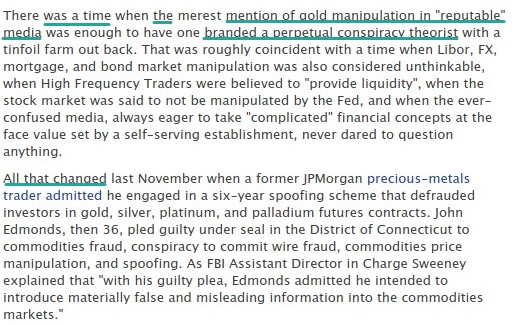 It says, "..was a time .. the mention of gold manipulation in (airquotes) reputable (airquotes) media would brand you a conspiracy theorist..."