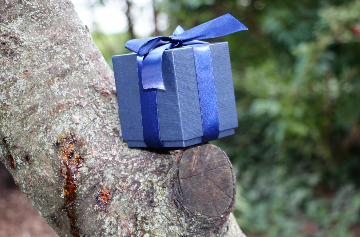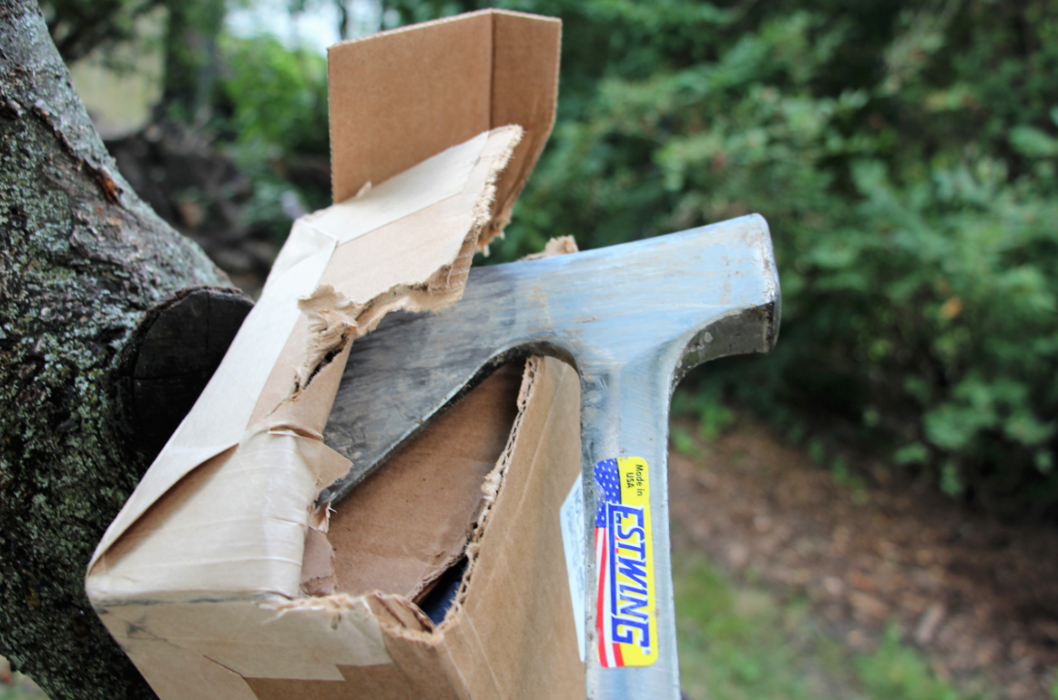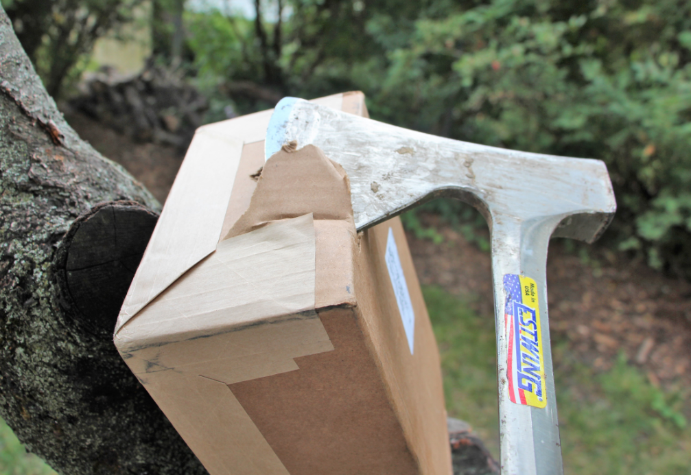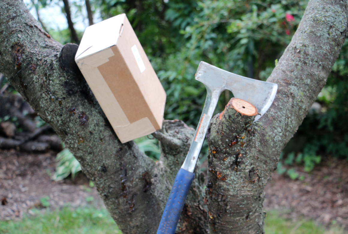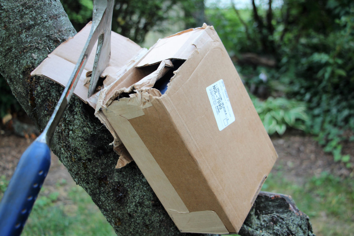 We start with a plain brown box and place it in a good unboxing location. How about the tree I've been chopping down?