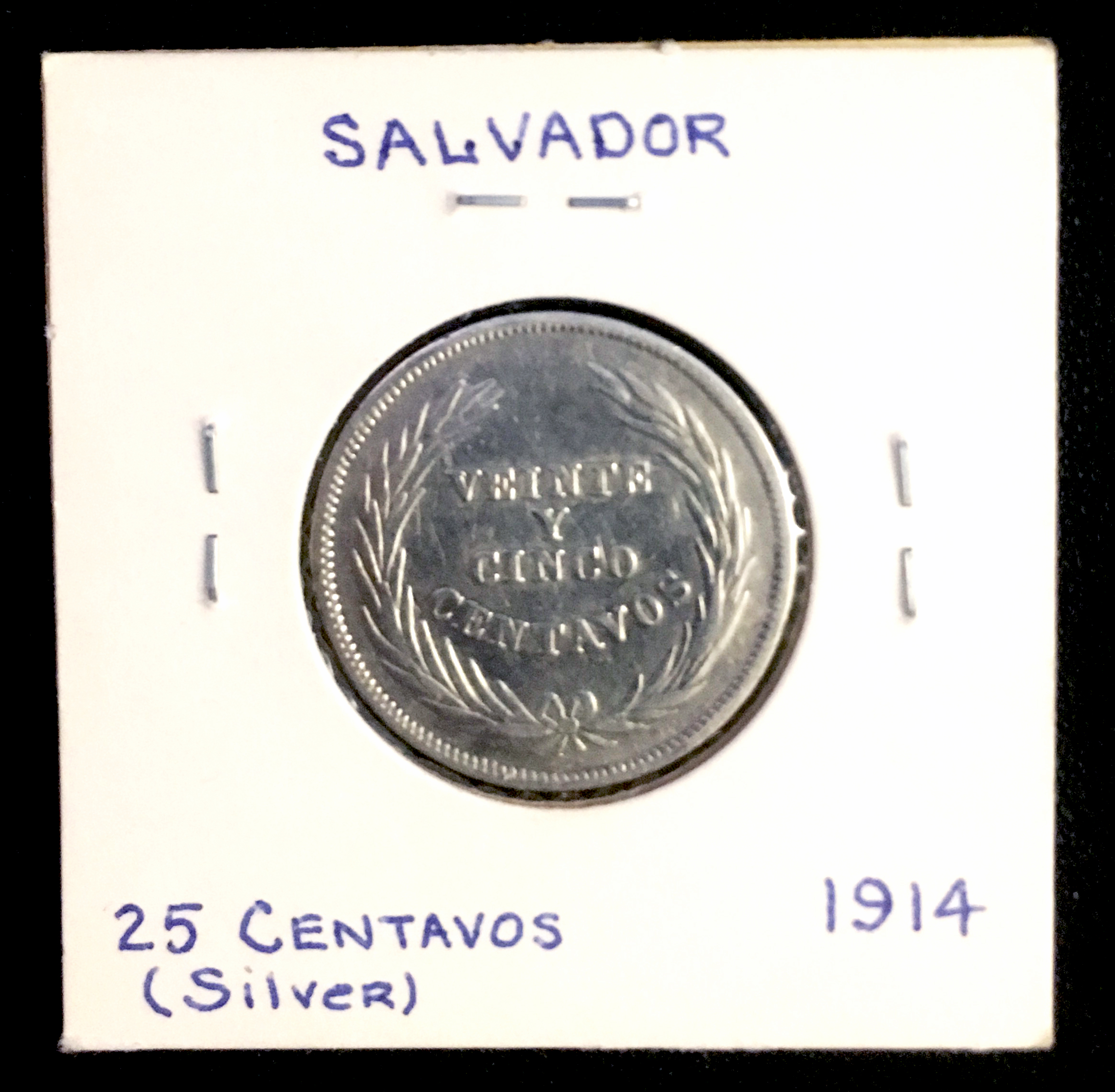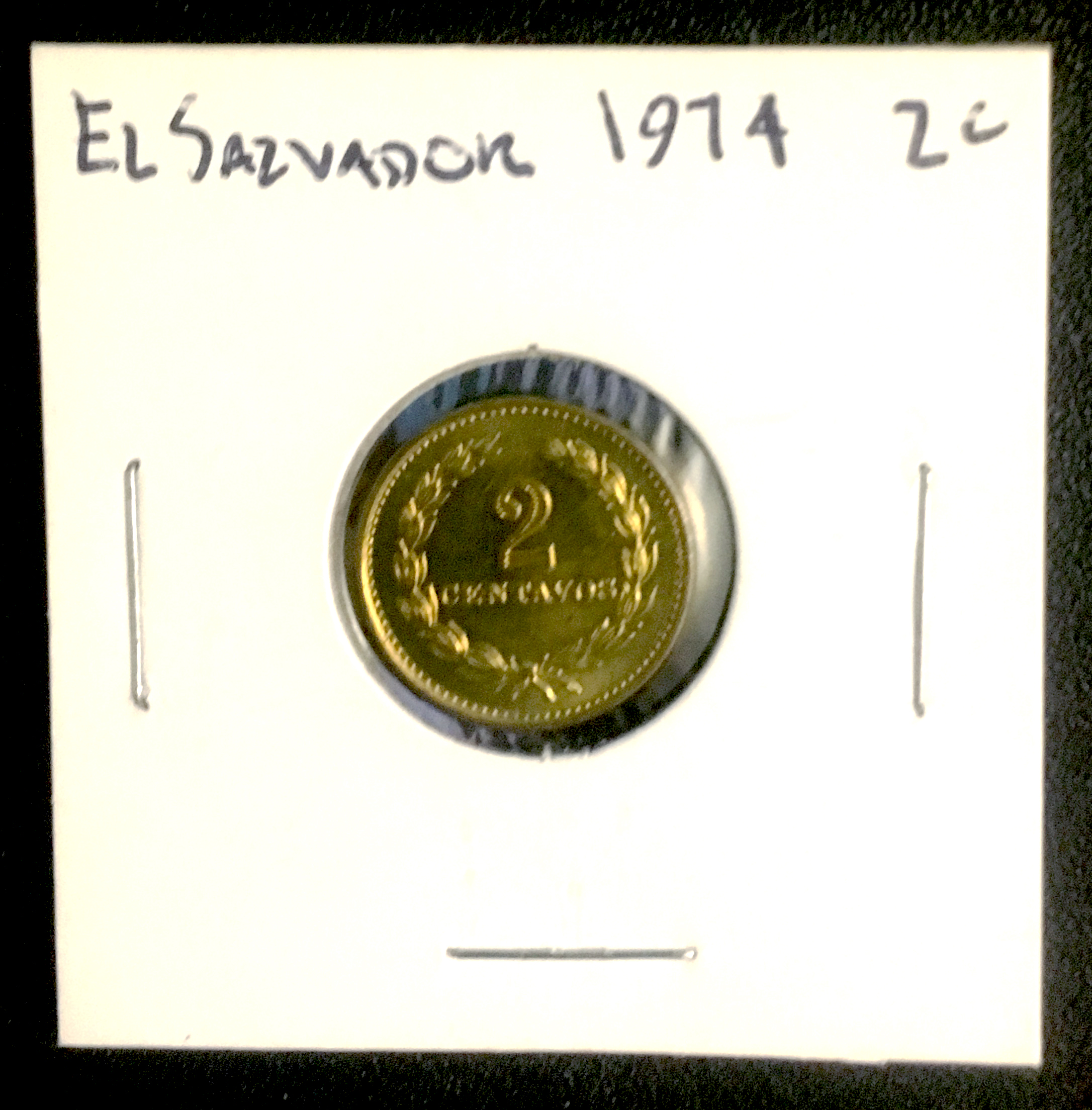 The first coin came from a local shop and is made from silver. The front shows the pyramid from their national flag. The back is spelled out, "Twenty Five Cents." The second coin is two cents and came from an Airbnb in San Salvador. It's in great condition.