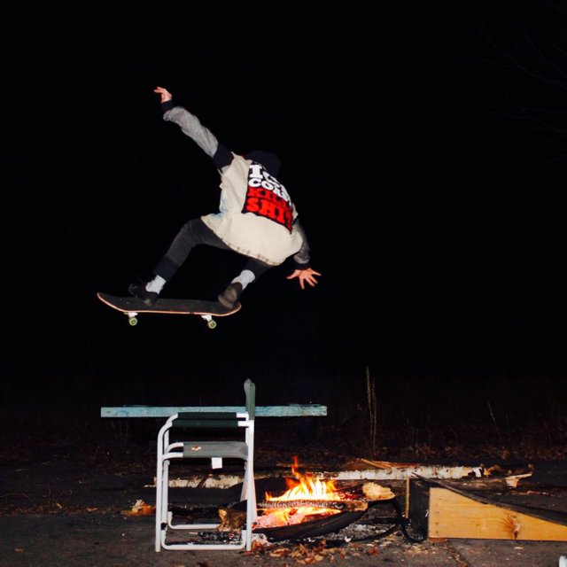 He does a clean 180 down some pretty big stairs and a dangerous but sick ollie over a chair and some flaming wood.