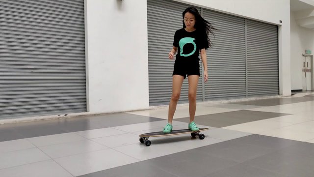@Vaelriey demonstrates us her Cross-step moves on her longboard. Awesome shirt yo, fits perfect with the shoes!