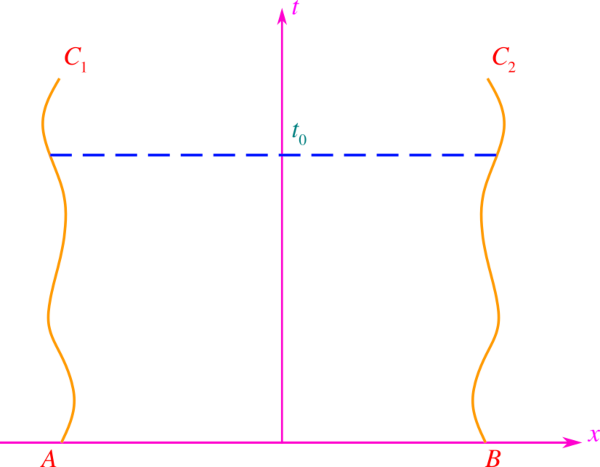 con fronteras t = 0, t = t0 > 0, C1 y C2, donde cada una de las curvas C1 y C2 intersecta líneas de constante t sólo una vez.