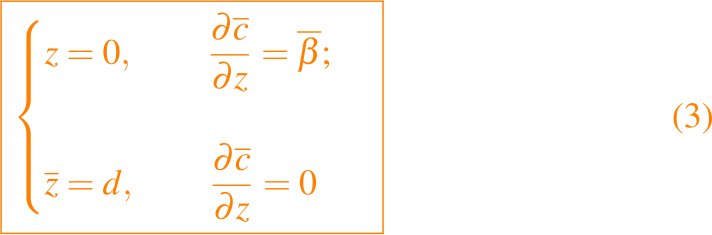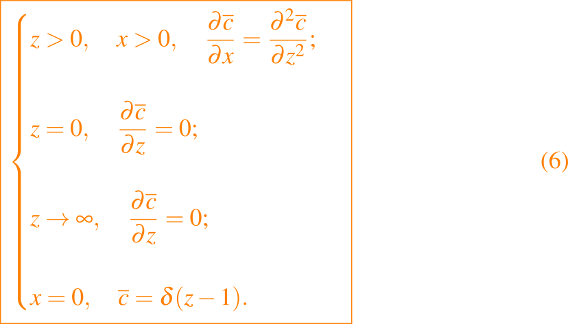 y no se dan condiciones cuando x tieneda a mas o menos infitio. Esto ahora define un problema parabólico bien planteado para c donde x ha reemplazado a t como la variable del tiempo, y buscamos soluciones bajo diferentes supuestos para d, β, U y D. El problema más simple es tomar β = 0, d tendiendo a infinito y asumir que U y D son independientes de z. Entonces, con variables adecuadamente escaladas, el problema del valor en la frontera es