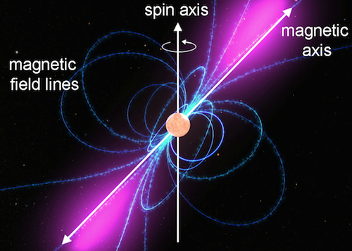 A pulsar, showing its rotation axis and its magnetic axis.