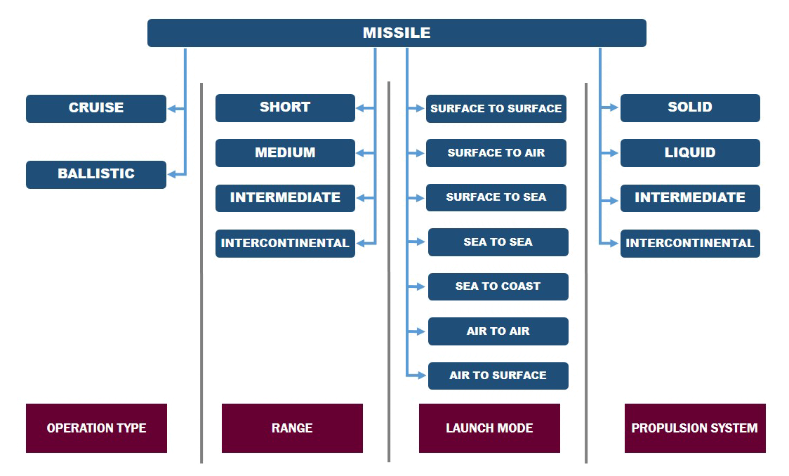 Military agencies across the across the world classify missiles by several means like launch mode, type, range, propulsion and so on. A graphical representation of missile categories are presented in Figure below.