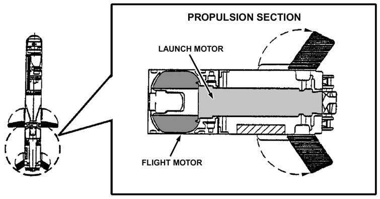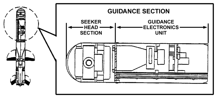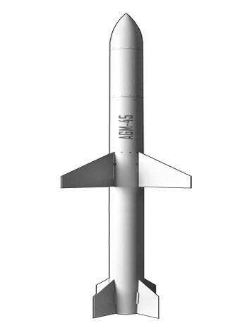Figure 3: Missile airframe (rotated projection of the original image), credit: Wikimedia Commons, author: NotLessOrEqual, license: CC0.An airframe is the physical structure that bears all other components of the missile. It also helps to achieve desired aerodynamic characteristics for the flight. The design of a missile is depended on the operation requirement in general. Modern military missiles serves a wide range of purpose that lead to a variety of structural design. Missile airframe is usually a cylinder shaped tube which contains the controlling and propulsion mechanism. The airframe is equipped with several set of flippers near the center and tail end. The flippers provide stability and helps the missile to navigate in flight. The size and number of flippers depend on the task assigned to the missile. The front end of the airframe carries the warhead of the missile. Front end design is much dependent on flight speed and desired trajectory of the missile. For example US Navy’s ‘RIM Terrier’ missile has sharp and slender nose to increase efficiency while travelling in supersonic speed. On the other hand the front end structure of ‘AIM Sidewinder’ missile is hemispherical that supports infrared sensors to receive precise tracking information.