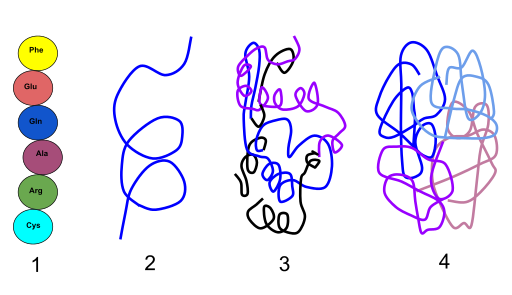 A Schematic Representation of The Four Levels of Protein Organization [License: CC-BY-SA 4.0, Author: Scurran15]: