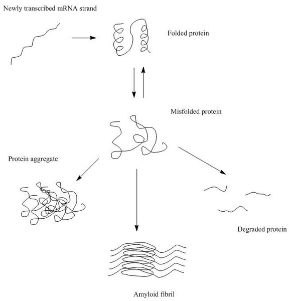 Wikicommons When proteins misfold, they form aggregates. Most times, proteins change their native conformation and this is hugely implicated in their formation of aggregates. Most proteins assume the alpha-helix form as their native conformation but at times, as a consequence of misfolding they assume the beta-pleated sheet form. The beta-sheets are more likely to form aggregates since they possess inter-chain bonding (bonds are formed by two beta-pleated sheet molecules) as opposed to the alpha-helices which possess intra-chain bonding (bonds are formed within the same molecule). This is probably why most proteins exist as alpha helices. There are proteins that exist as beta-pleated sheets anyway. An example is the immunoglobulin. The aggregates formed by misfolded proteins can be referred to as amyloids or amyloid deposits. They are known to induce oxidative stress, block cellular functions and turn other normal proteins to toxic proteins through a process known as seeding. The deposition of amyloids and degeneration of tissues and organs as well as the development and progression of diseases is all just a correlation and does not exactly indicate causation but it implies however that these amyloid deposits may very much be responsible for the diseases.