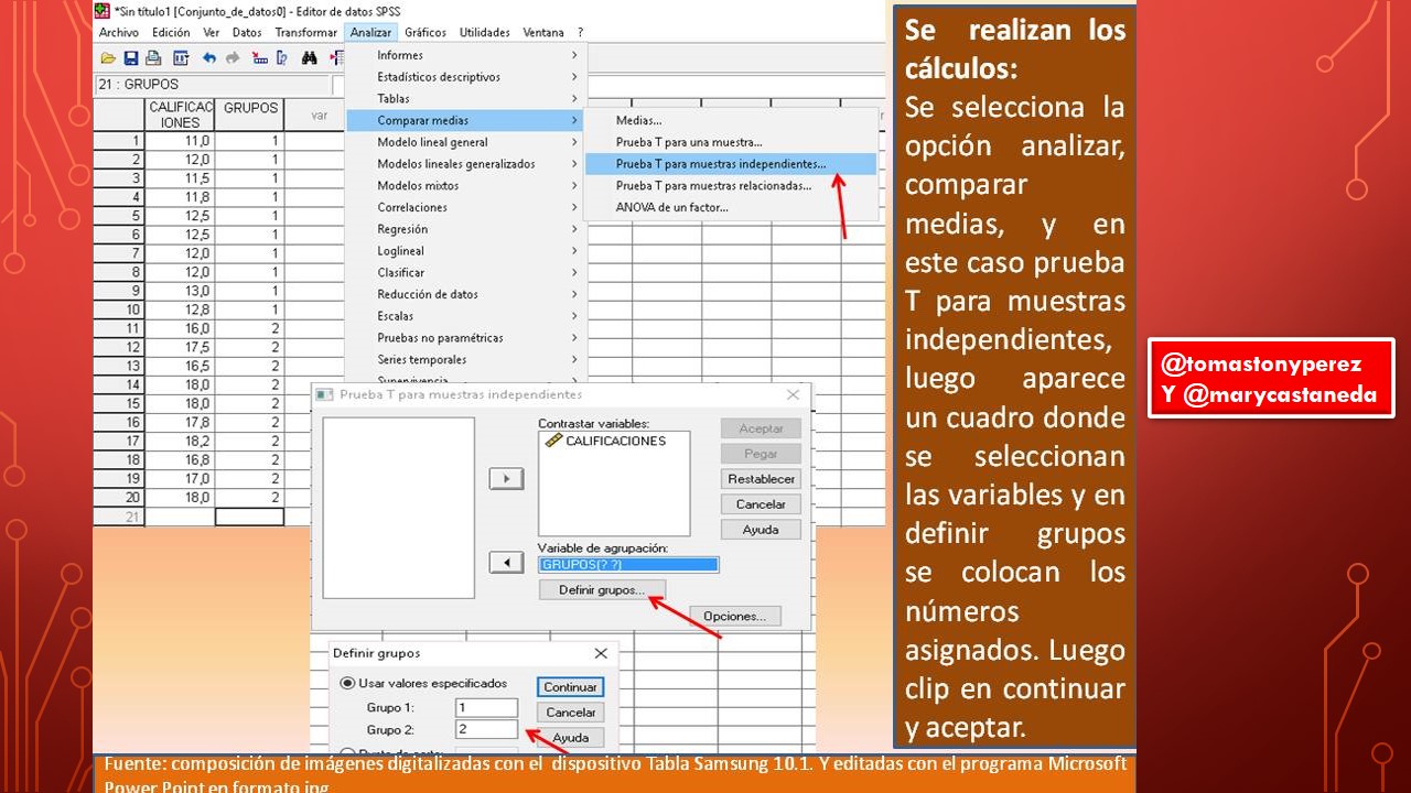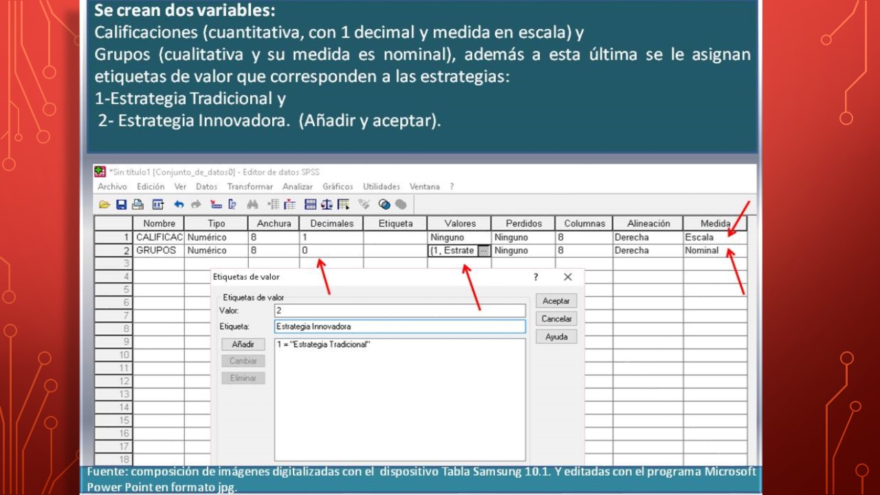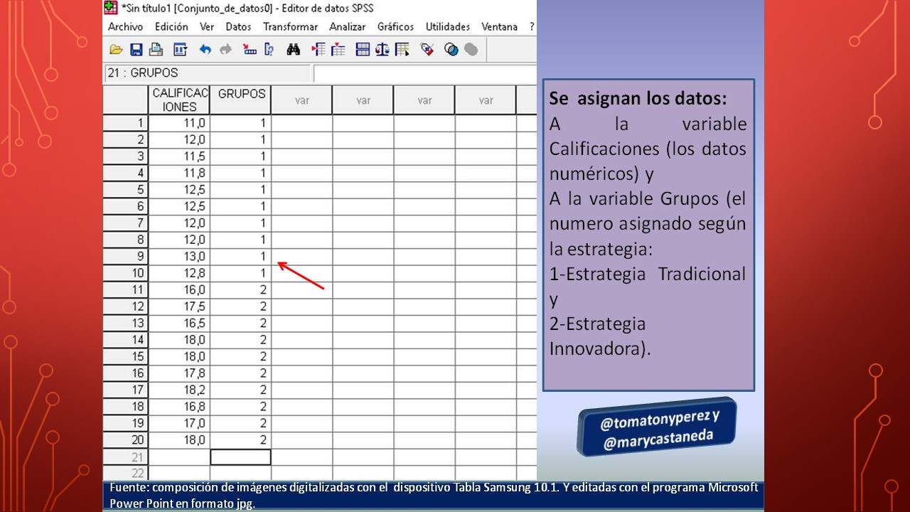 Una vez que las variables han sido creadas, se procede a asignar los datos que previamente el investigador ha recolectado; en el caso hipotético que nos ocupa, se consideraron los datos de las calificaciones de dos grupos de dos secciones diferentes de un curso de estadística; donde al grupo uno (1) se le aplicó una estrategia tradicional y al grupo dos (2) la estrategia innovadora, cada sección, está conformada por diez (10) sujetos cada una. Nótese que se trata de dos grupos diferentes, esto indica que estamos en presencia de prueba T para muestras independientes. En virtud de lo expuesto, a la variable calificaciones se les han asignado los datos en orden; primero se introducen los datos del grupo uno y seguidamente en la misma columna, los datos del grupo dos. Posteriormente corresponde asignar los datos a la variable independiente, que por ser cualitativa no es medible numéricamente, sin embargo le hemos asignado al programa un número que indica el tipo de estrategia estudiada, estrategia tradicional número uno (1) y estrategia innovadora número dos (2) solo así el programa podrá identificar las calificaciones de los sujetos de acuerdo a la estrategia aplicada. Esta variable se observa en la columna siguiente a la variable calificaciones y el investigador debe ser cuidadoso a la hora de asignar los números correspondientes; en este caso los primeros diez (10) sujetos corresponden al grupo de la estrategia tradicional, por tanto se les asignó el número uno (1) y el resto corresponde a la estrategia innovadora, asignándoles el número dos (2). Invitamos al lector a observar con detenimiento la siguiente figura, la cual se explica por sí sola.