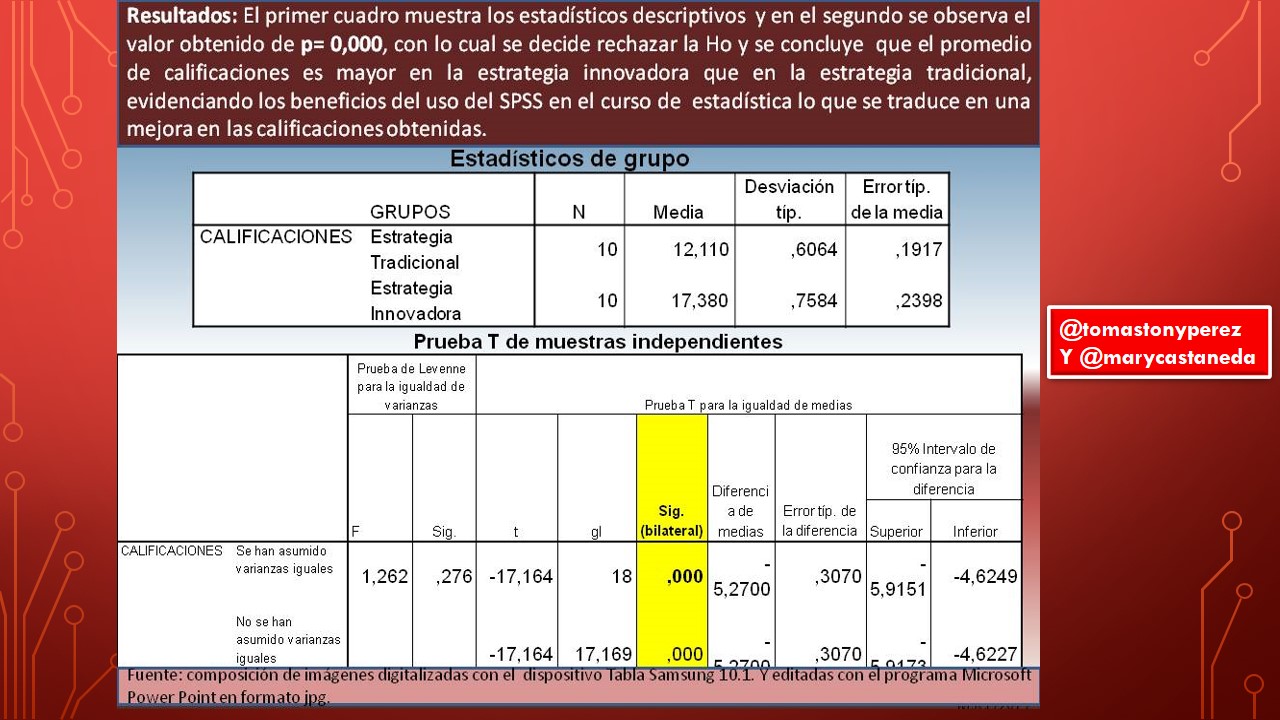 En todo estudio, independientemente del paradigma adoptado, resulta de suma importancia, la interpretación de los resultados obtenidos, pues de ello dependerá la toma de decisiones de interés de la investigación en curso; tal como se observa en anterior imagen, donde el resultado de p=0,000 ; permite concluir que el promedio de calificaciones del curso de estadística, definitivamente es mayor en la sección que fue sometida al tratamiento con la estrategia innovadora, infiriendo que esta resulta ser la estrategia más adecuada, pues su uso se traduce en mejoras significativas en las calificaciones. Estas y otras aseveraciones son posibles gracias a la experticia en el manejo del software, por parte del usuario.