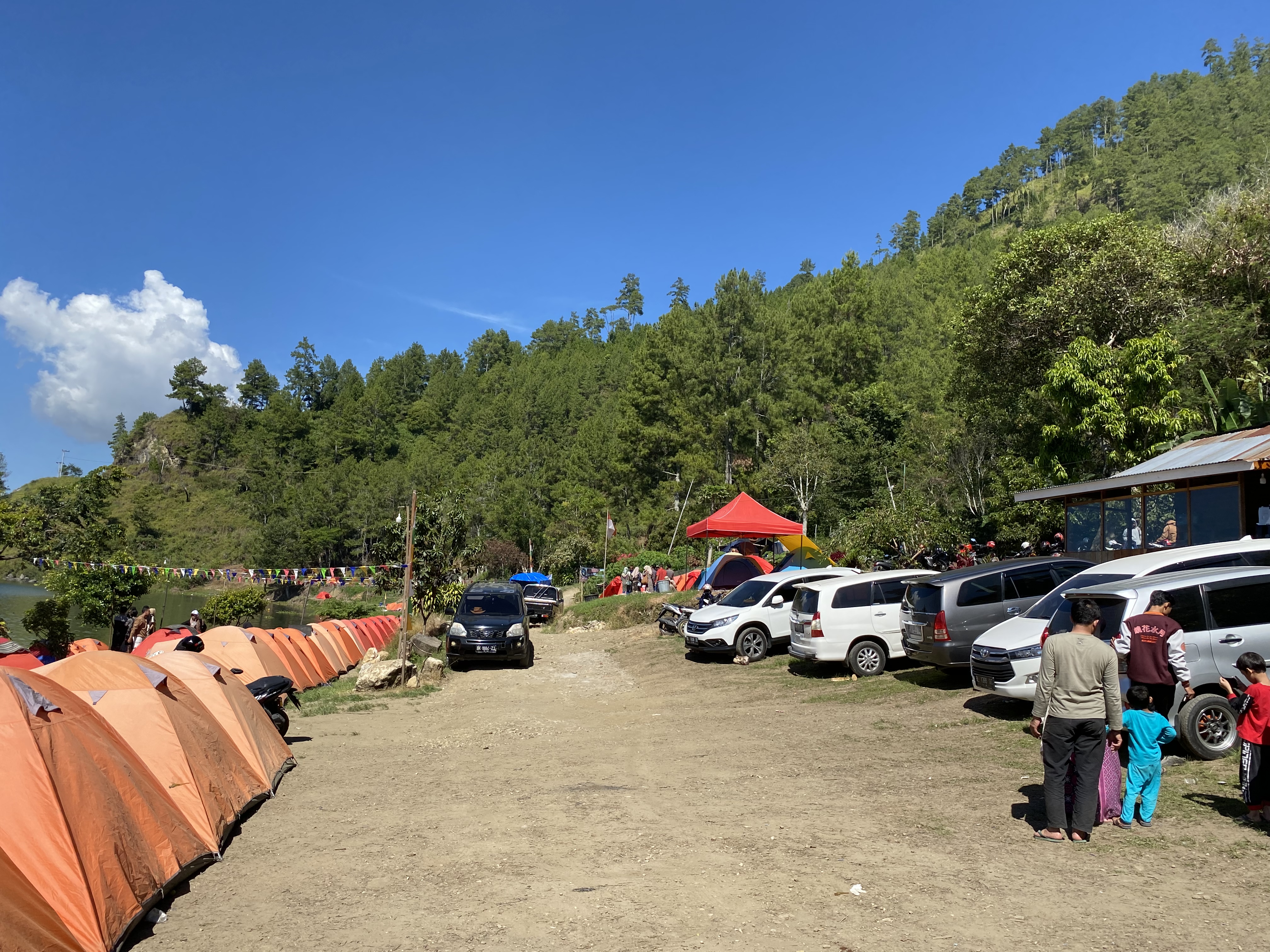 The scenery at this campsite is very beautiful where I can see the lake and mountains and the clouds that cover the top of the mountain. The air here is very cool, especially at night and in the morning. The water in the lake feels very cold and can make your body shiver.