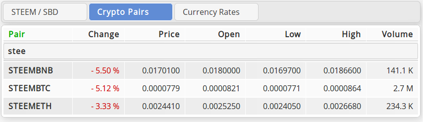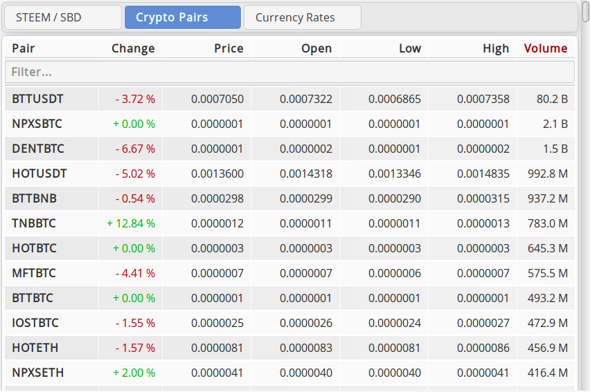 Here we have an overview of many available crypto currency pairs. The column headers can be clicked for sorting the data (in this image it's sorted by volume, descending).