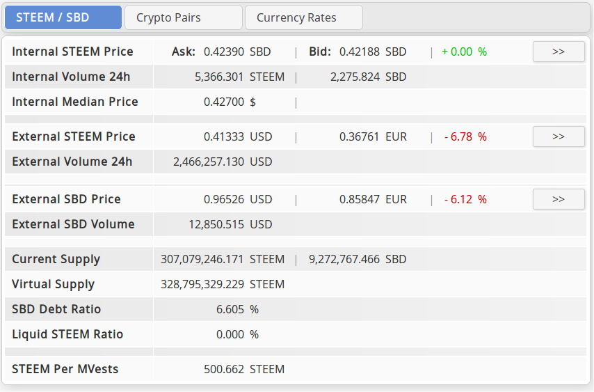 I renamed the 'Steem Info' tab to 'Market Info', because there are now a few more market related data inside. The first section shows the STEEM and SBD prices etc. as before: