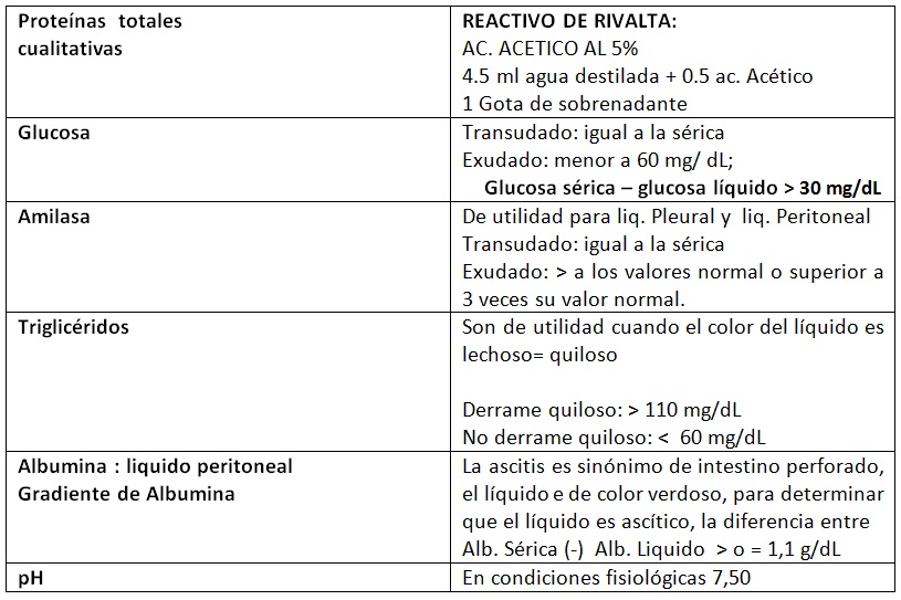 Examen Químico: se utilizan los criterios de Ligh para identificar un Transudado de un Exudado. Para ello es necesario haber tomado una muestra desangre alpaciente en el momento de haber extraído el líquido.