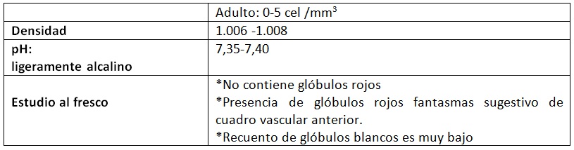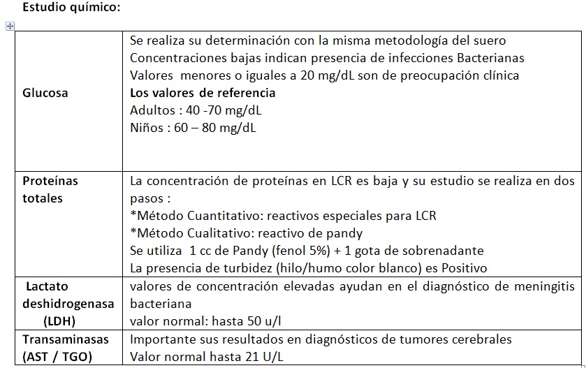 El estudio de líquido cefalorraquídeo ayudara al galeno en el diagnóstico de meningitis aguda o crónica, hemorragias sub-aracnoideas o leucemia. Debido a que es un Ultrafiltrado del plasma, contiene los mismos componentes pero en menores concentraciones.