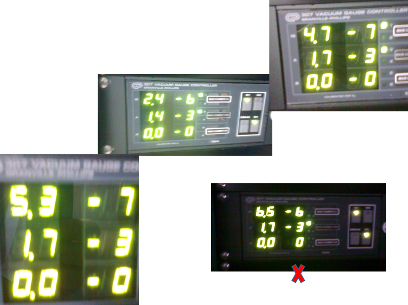 El vacío dinámico debe mantenerse en alto vacío, ya que cuando es mayor de 7x10-6 Torr la fuente del cañón de electrones se desconecta automáticamente para proteger la vida útil del filamento!. Normalmente se controla el flujo de corriente para que no ocurran cambios bruscos de temperatura en el interior de la cámara de deposición, ya que esto provocaría un aumento en la presión y se apagaría el sistema.