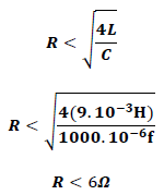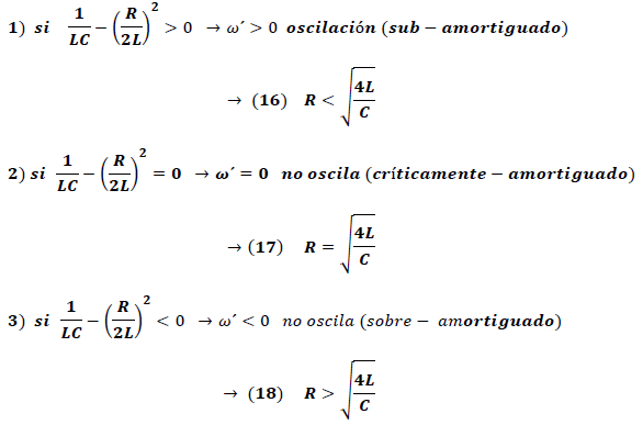 La frecuencia angular dada por la ecuación (15), permite analizar el tipo de oscilación que se obtiene de acuerdo al valor de la resistencia que el sistema ofrece, de la que se desprenden los siguientes casos:
