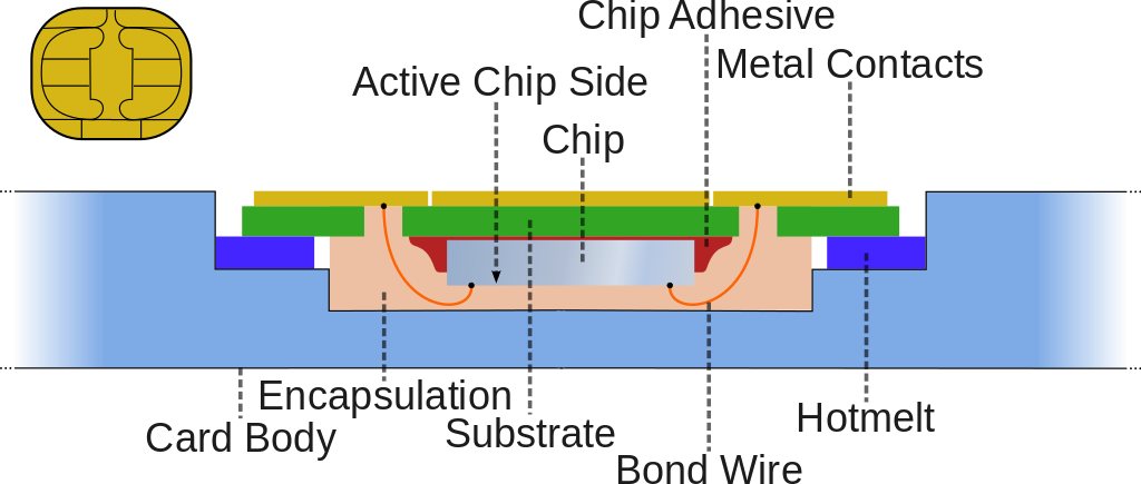 A cross section of contact smart card. Image source Wikimedia. Creative commons license 3.0