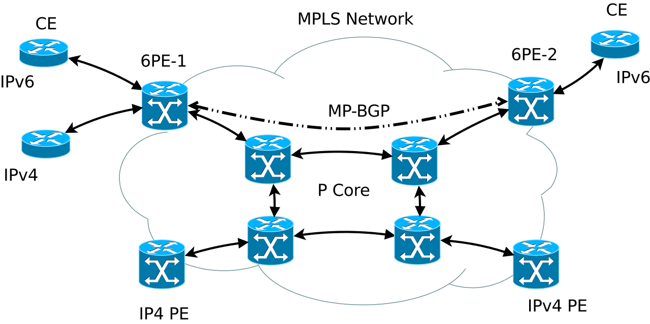 An MPLS network connecting various customers (CE) over a multiprotocol border gateway protocol (MP BGP) network. Image source Wikimedia. A Creative Commons Attribution-Share Alike 3.0 Unported, 2.5 Generic, 2.0 Generic and 1.0 Generic license.