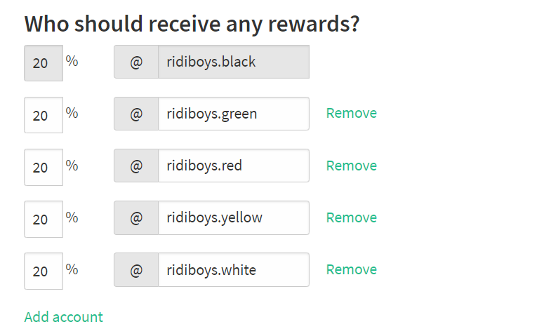 <개새끼소년>의 NFT는 'Never Forget Trust'입니다. 그러니까 일단 기본 계약기간이 5년인 통상의 출판 계약에 따라 5년 동안 인세를 모계정인 @ridiboys.black 계정에 SP로 동결시킬 생각입니다. 그리고 @upvu와 같은 보팅 서비스에 임대하고 매일 포스팅을 해서 생겨난 보상을 5개의 계정에 분배하려고 합니다.