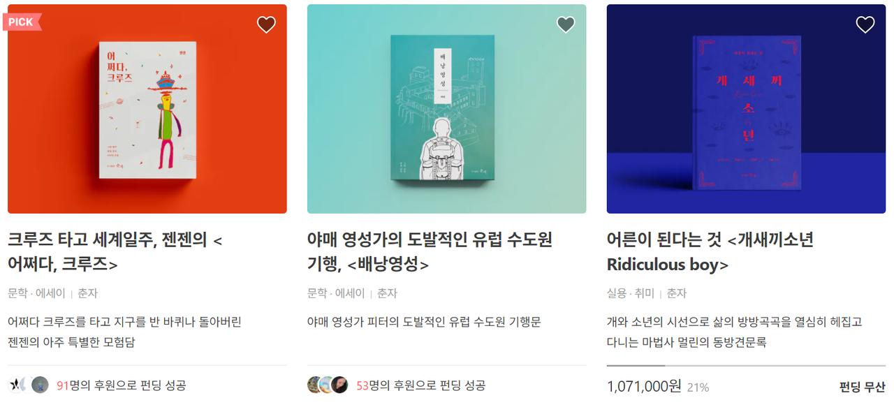 <개새끼소년 Ridiculous boy>는 텀블벅 펀딩에 실패했지만 도서출판 춘자의 다음 책 <배낭영성>과 <어쩌다, 크루즈>는 모두 텀블벅 펀딩에 성공하였습니다. 덕분에 춘자는 두 권의 책을 발행할 수 있었습니다. 이 과정에서 마법사는 텀블벅 사이트가 영화 제작비 조달이 어려운 젊은 영화인들이, 이럴 바엔 아예 펀딩 사이트를 직접 만들어 보자 해서 만들어졌다는 창업스토리를 듣게 되었습니다. 코딩을 하나하나 배워가며. 시대의 흐름을 잘 읽은 탓인지, 텀블벅은 날로 성장해서 결국 성공적으로 엑싯을 했다고 하더군요.