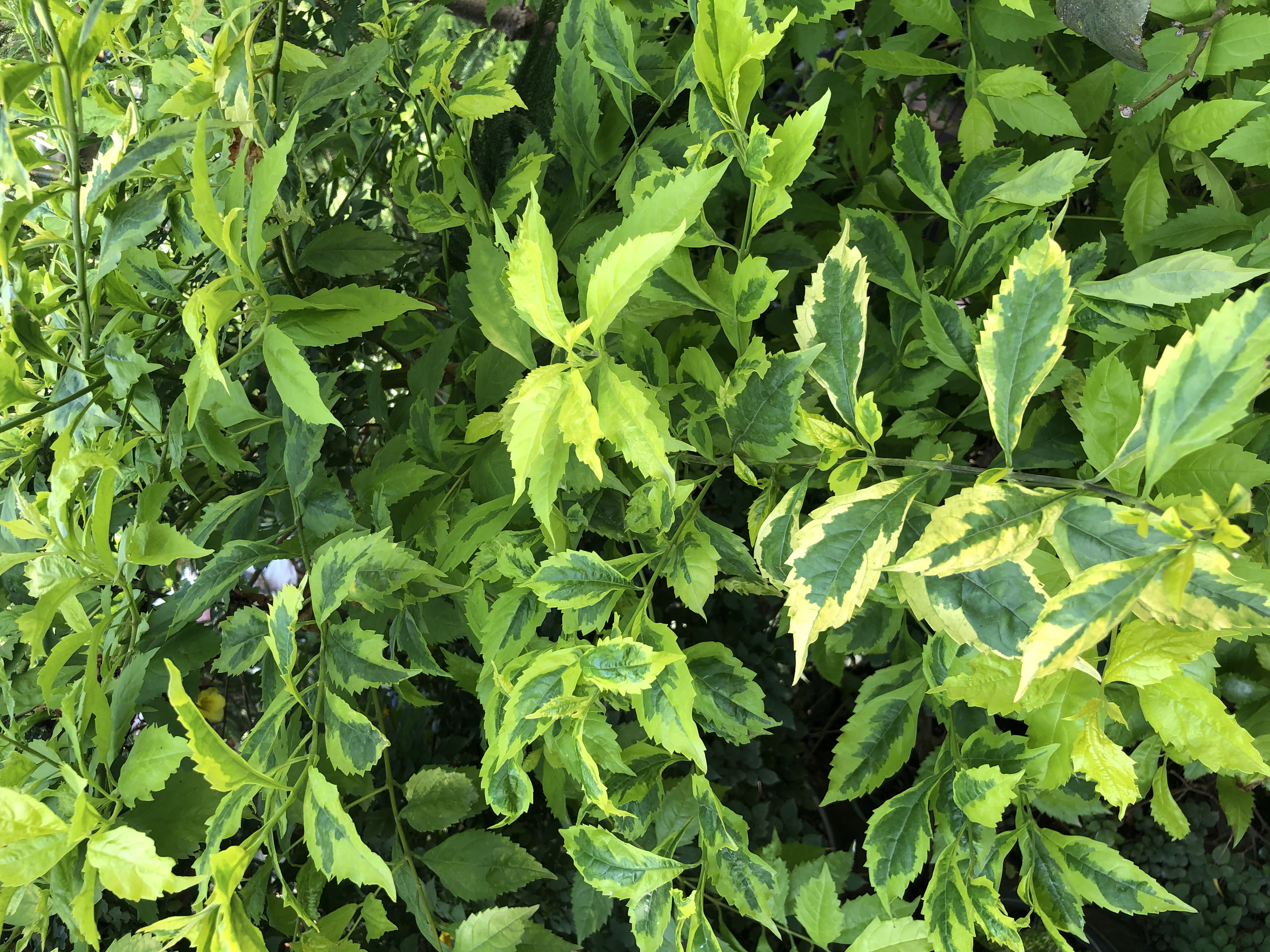 Its variegated leaves are mostly light cool green with serrated, cream to light yellow leaf margin.