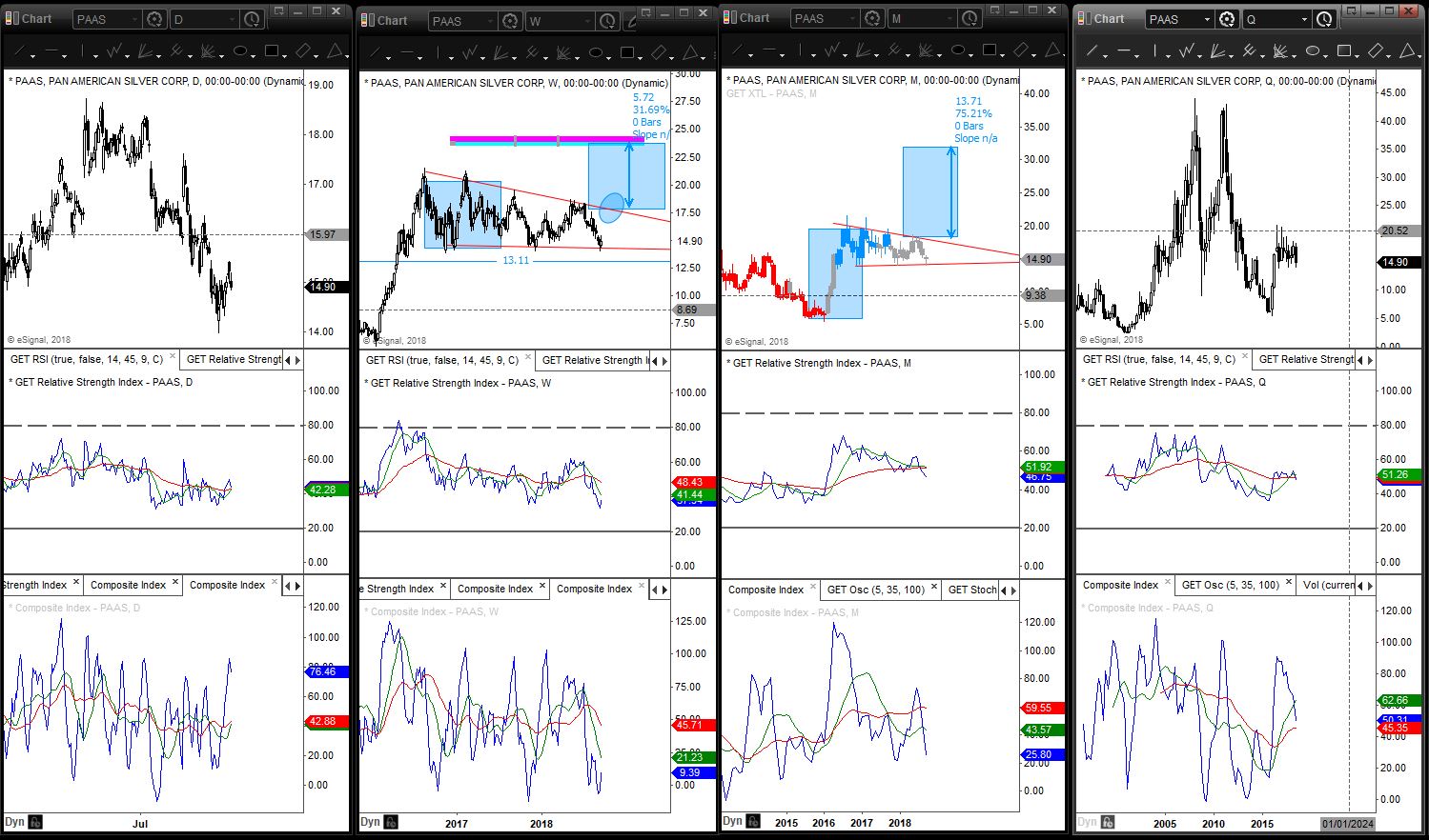 PAAS is looking quite promising right now. It looks very similar to GSS. As soon as PAAS breaks $18, it will be a buy from me for a short-term profit of $23.54 which is 31.69% (see weekly chart). And a monthly bull flag target of $32.05 or a 75.21% profit. I will double down after it breaks $22.10. I have a tight stop loss at $13.11. RSI is also very nice.