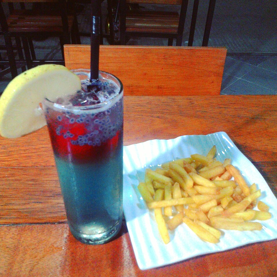 sambil menemani malam yang tenang ini saya memesan blue ocean dan kentang goreng untuk menemani saya di malam ini bersama teman saya.