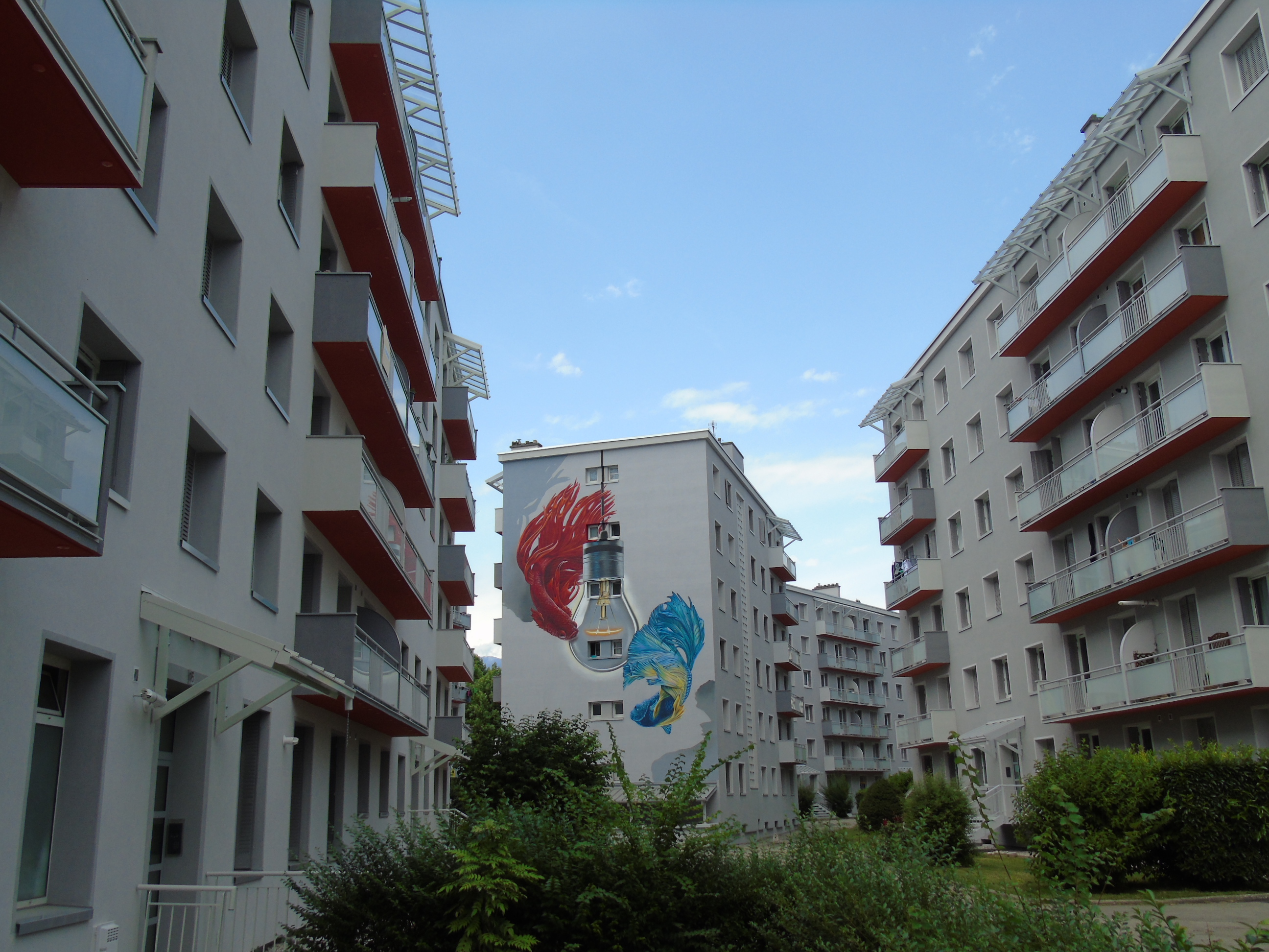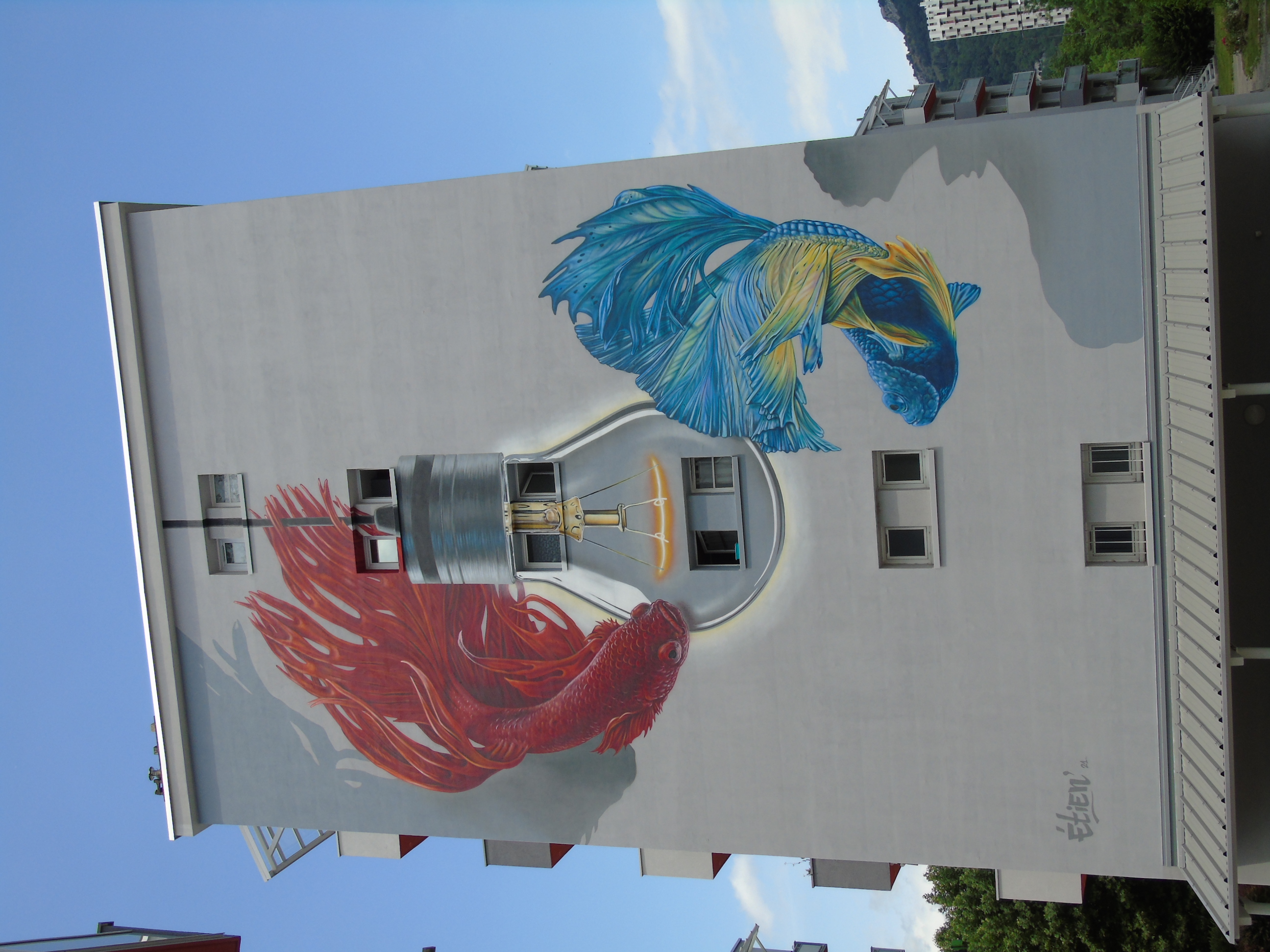 Une très belle fresque sur ce grand immeuble, ce sont les poissons qui tournent autour d'une ampoule.