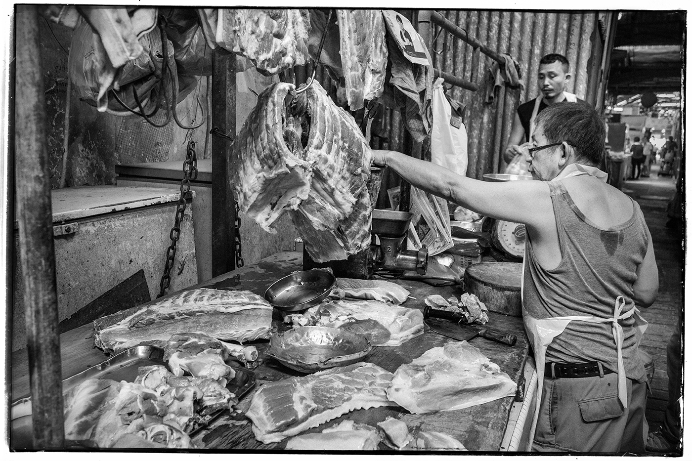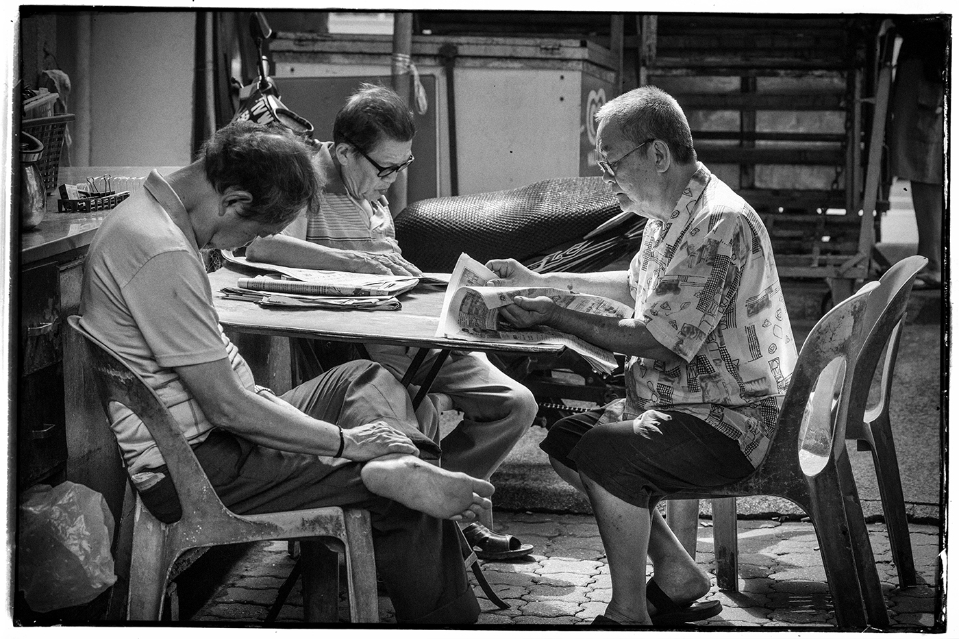 One thing I always look out for when shooting in the street is interesting lighting. Like in this shot of these old guys reading their newspapers down one of the narrow lanes. I like they way the light from behind is creating a rim light effect of the guy on the right. This works really well for black and white photography where tone, light and shade are so important.