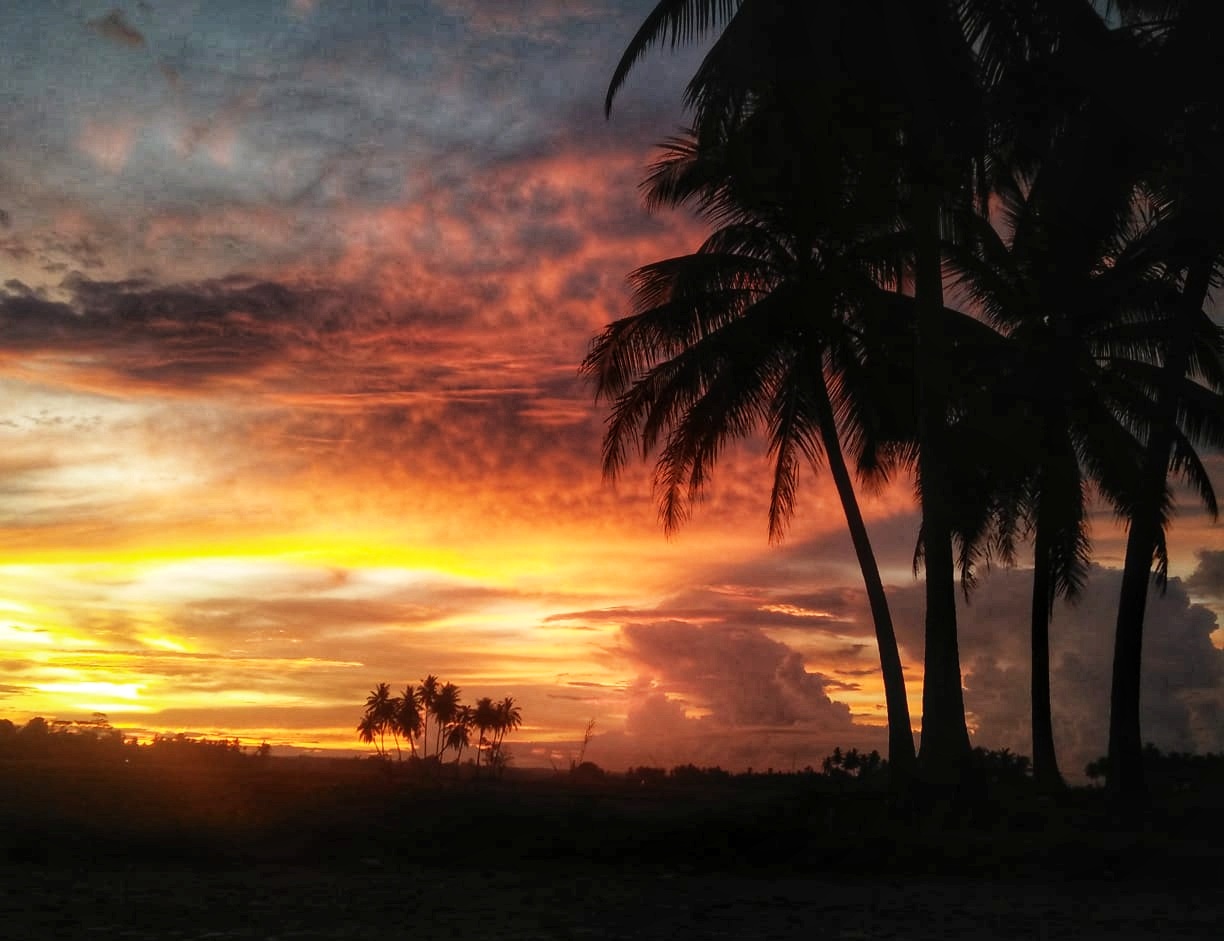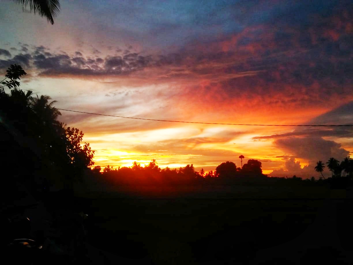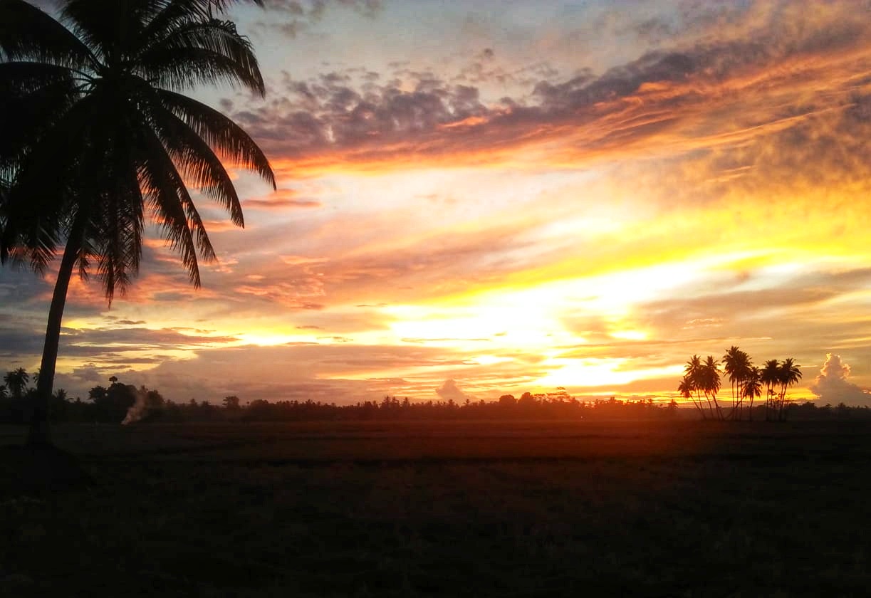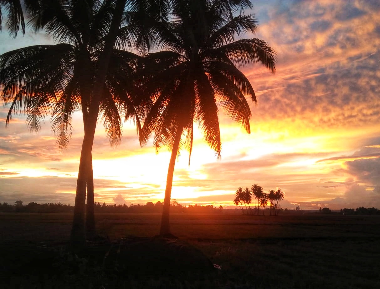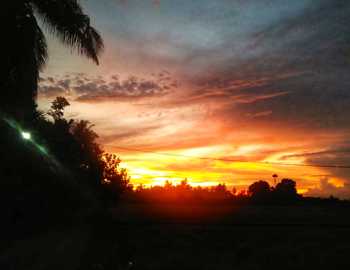 In the afternoon towards evening on the way home from daily activities. As usual, on my way home from my activities, I stopped at the market to buy snacks for the children at home. After I went shopping, I continued my journey home until in the middle of the rice fields that had already been harvested, I saw the rays of light from the setting sun, which had a yellowish and reddish color, so I quickly to take a picture at that time and I continued to look for the right location to take the sunset photo.