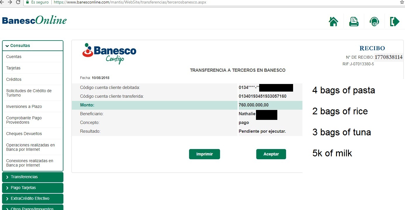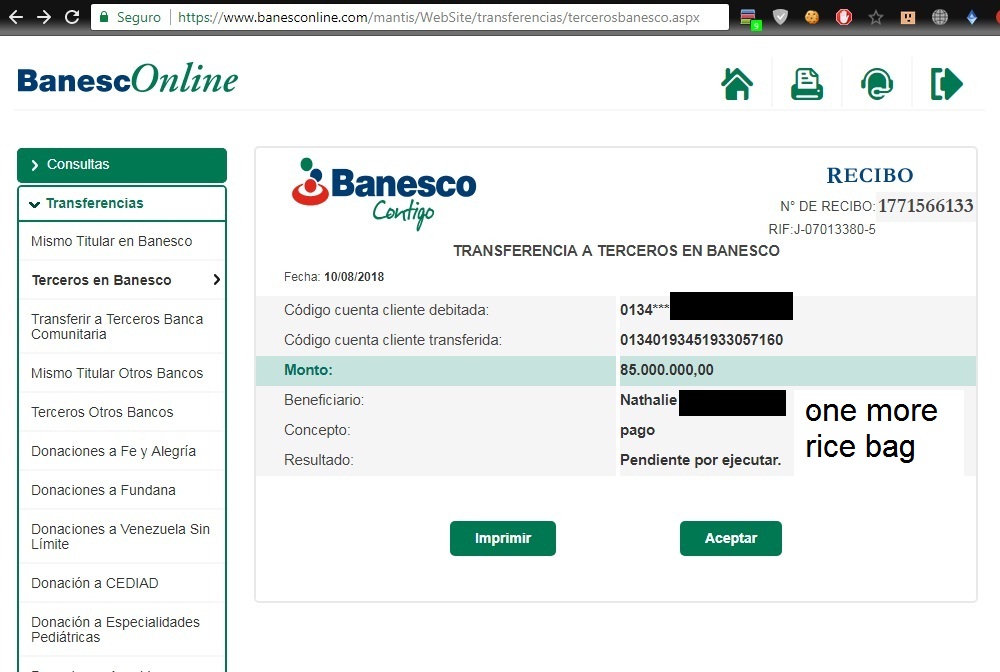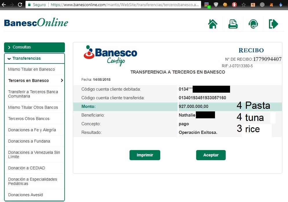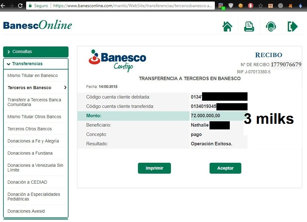 After the donation of 2.96 gb, a new donation was made on August 14, of a total amount of 4,184.948.098 gb, which in bolivars was converted into Capybara Exchange in a total amount of 1.000.000.000 bsf, plus the sum of 63.250.000 bsf that @santiagolaw personally used to acquire 10 packages of Cerelac of 400 grams each one.