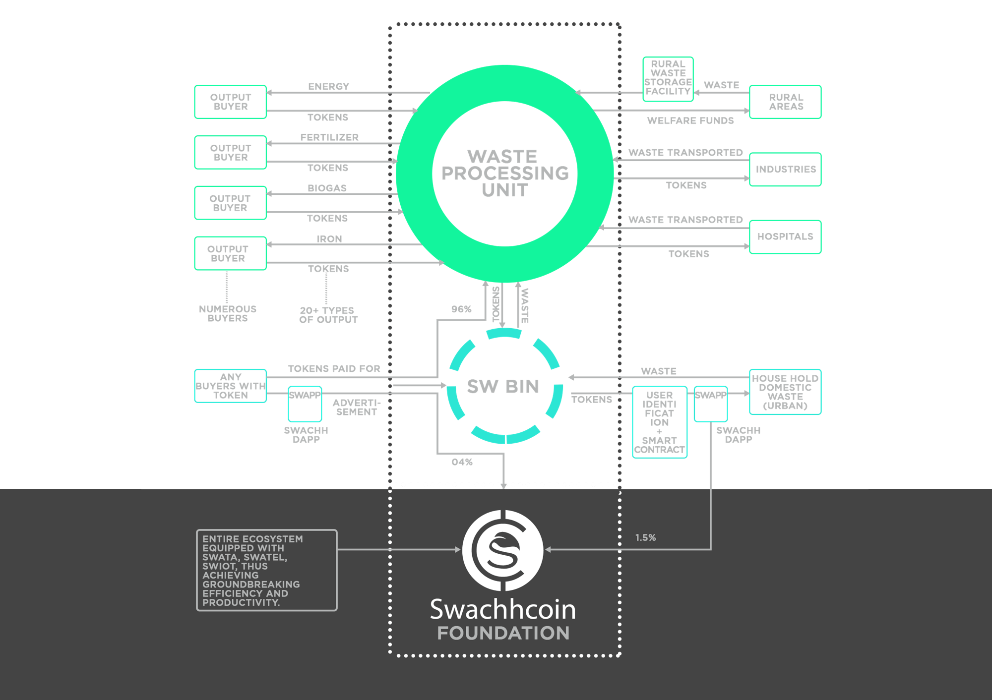 Swachhcoin will act as an global ecosystem to bring together the enormous but currently siloed and disorganised sector of waste management which otherwise is filled with commendable big and small inventions where individual companies are working to the best of their capabilities to bring about a change in the degrading environment and planet but with little success. The Swachhcoin ecosystem will be the most technically advanced, broad and efficient waste management platform, which unlike any other player, will employ Adaptive Intelligence, Internet of things, Big Data and Blockchain, together, in sync with each other, thus enabling achievement of ground breaking waste management efficiency. Not only this, it will incentivize any and all domestic households globally for contributing the input in the waste processing industry in the form of Swachh Tokens.