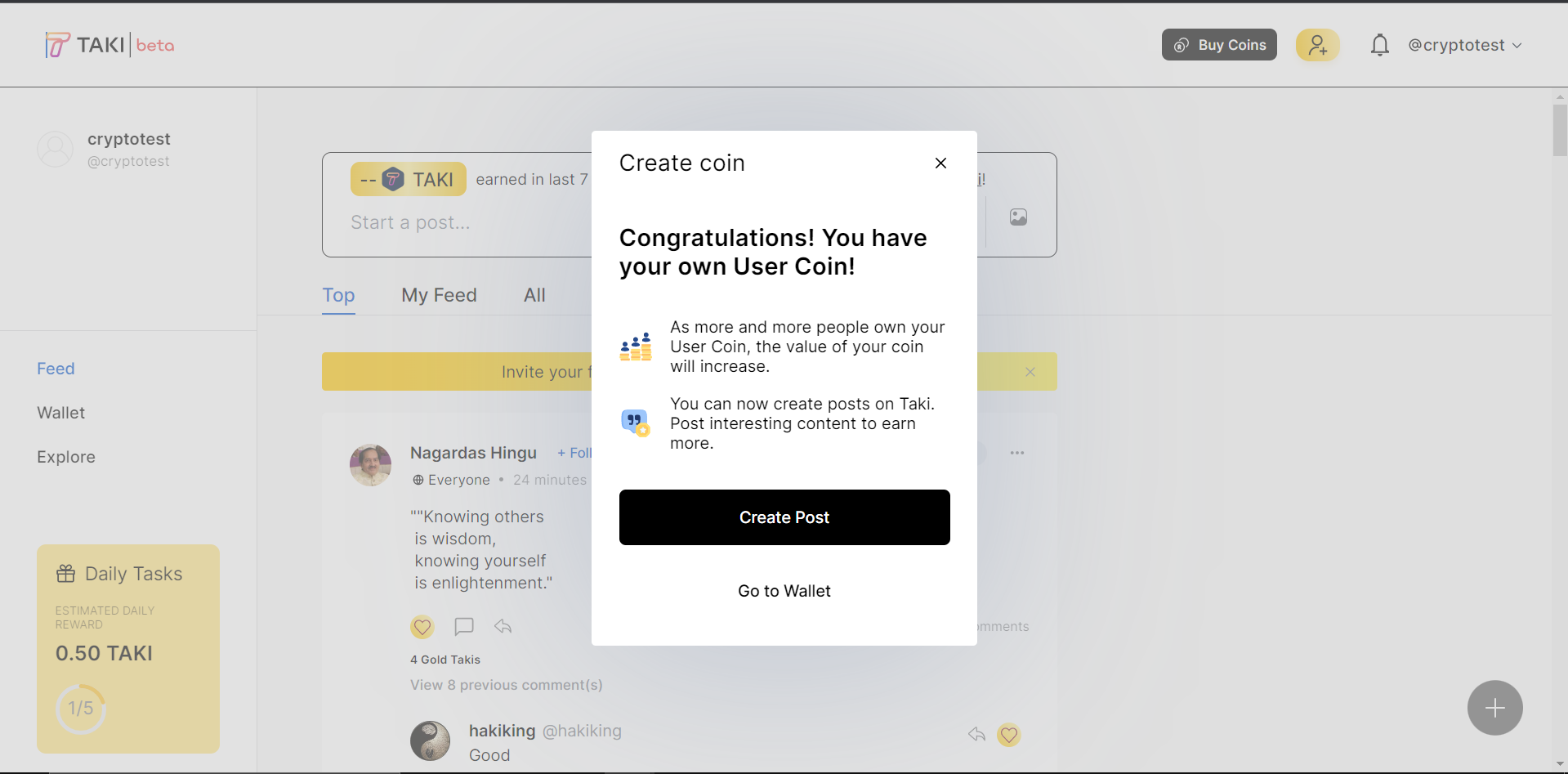 Anda bisa pergi ke beranda depan untuk membuat postingan menarik, semakin banyak positingan menarik anda akan kemungkinan mendapatkan Gold Taki dari komunitas lainnya untuk postingan anda, jadi tidak hanya anda yang akan mendapatkan keuntungan Taki Coin tapi pemegang coin anda pun juga ikut merasakan keuntungan dari positngan anda yang mendapatkan Gold Taki dari komunitas lain