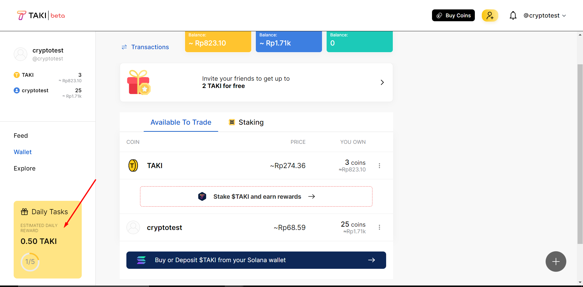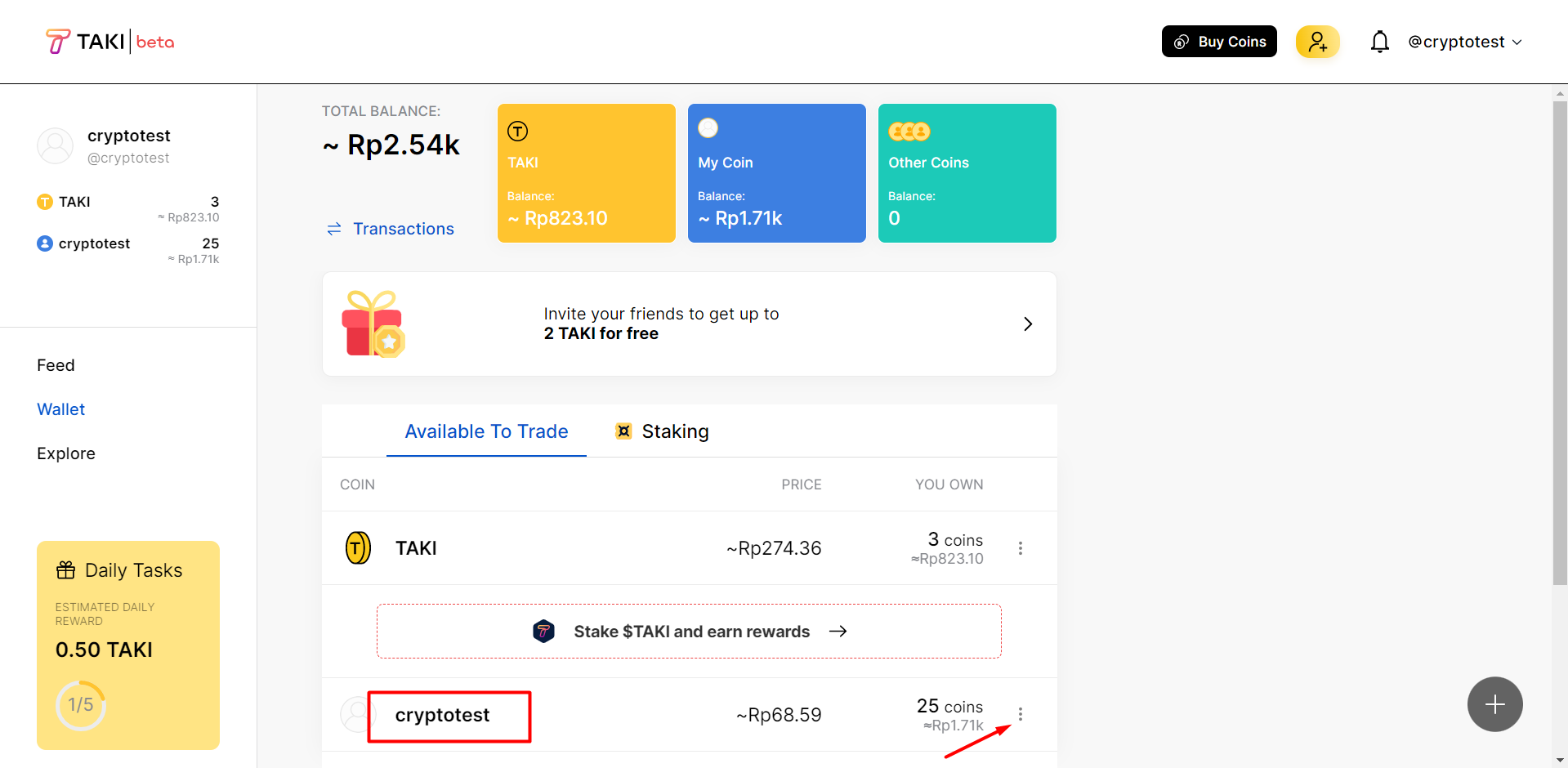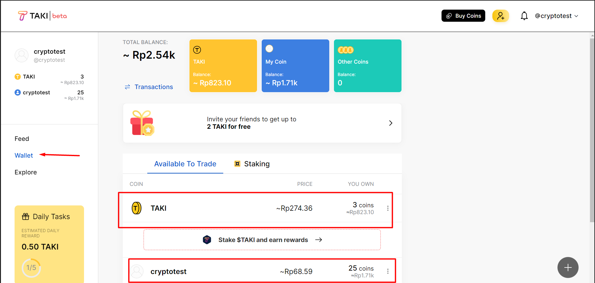 Pergi ke wallet anda dan anda akan melihat coin gratis anda berupa Taki Coin dan Coin anda sebagai contoh cryptotestcoin yang ada dibawah gambar kotak merah