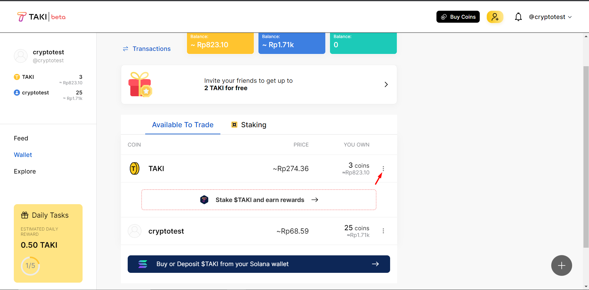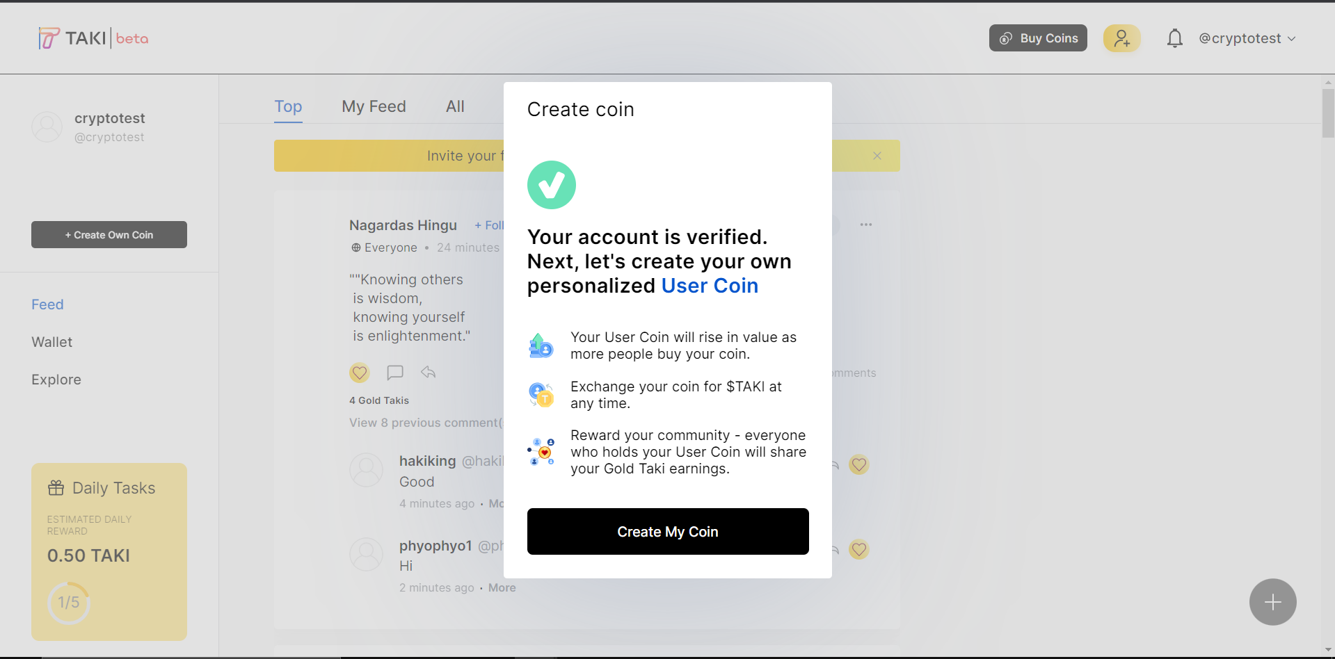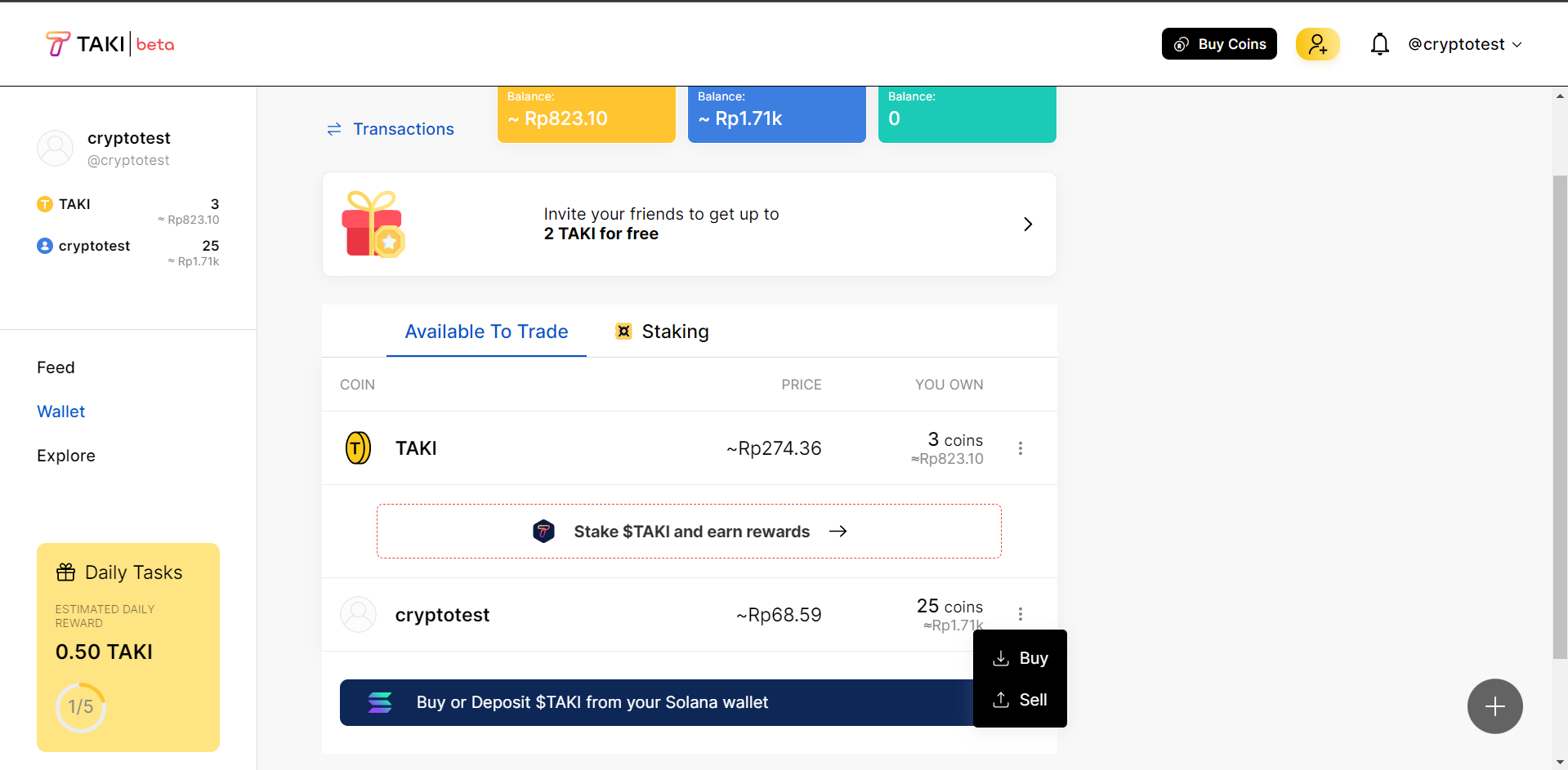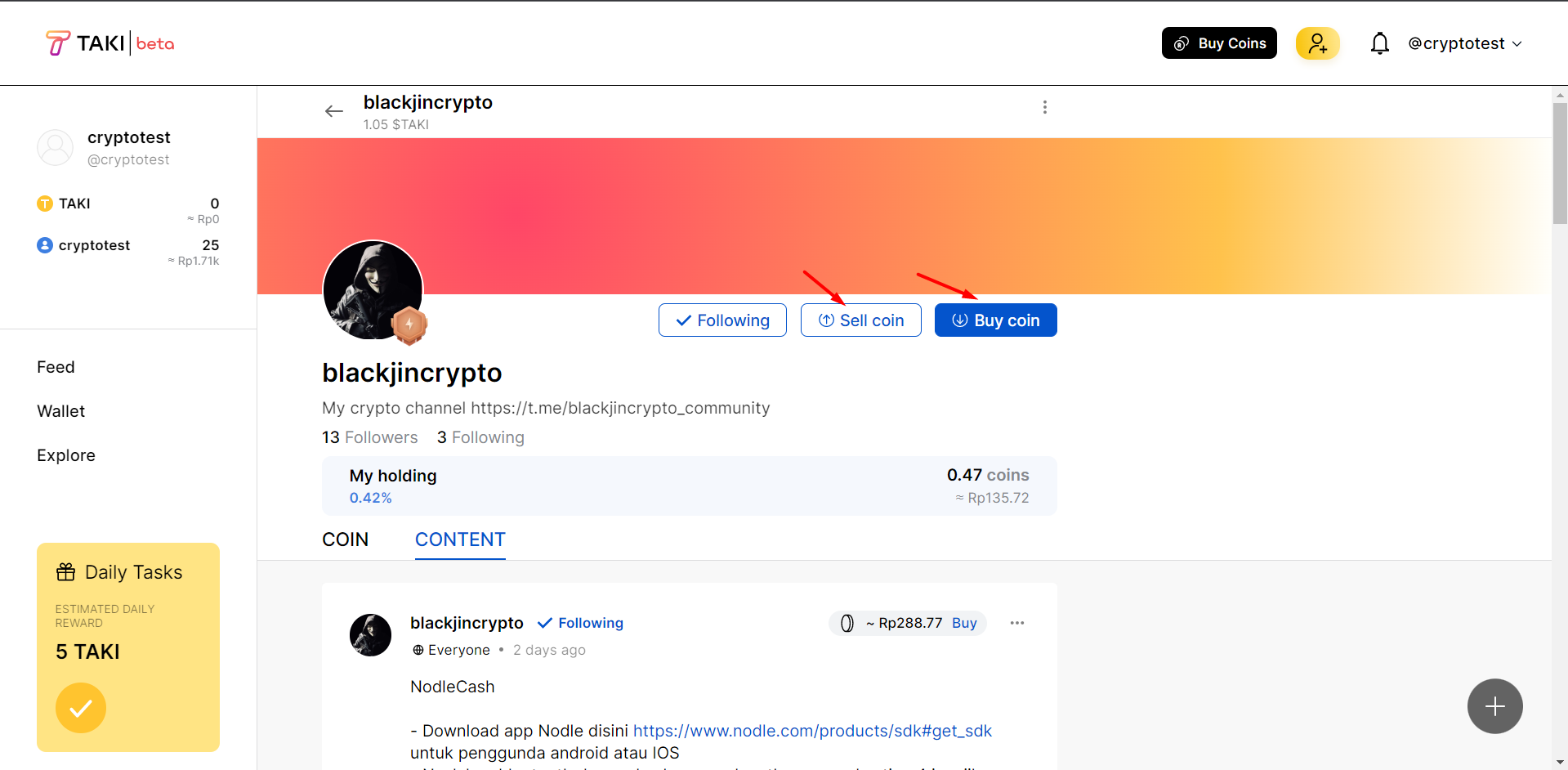 Setiap pengguna baru mendapatkan gratis Taki Coin yang bisa digunakan untuk membeli coin orang lain yang populer, sehingga ketika coin yang anda beli itu naik anda bisa menjualnya kapanpun dan juga anda bisa mendapatkan keuntungan dari memegang coin yang anda beli dibagi dari hasil pendapatan Gold Taki yang didapatkan dari postingan si pemilik koin yang mendapatkan banyak suka