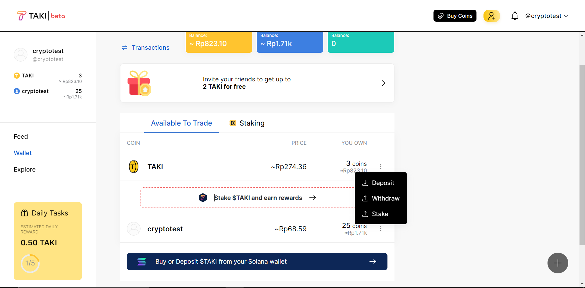 Perhatikan gambar dibawah ini pada balance Taki Coin anda bahwa anda bisa menarik , deposit atau staking Taki anda