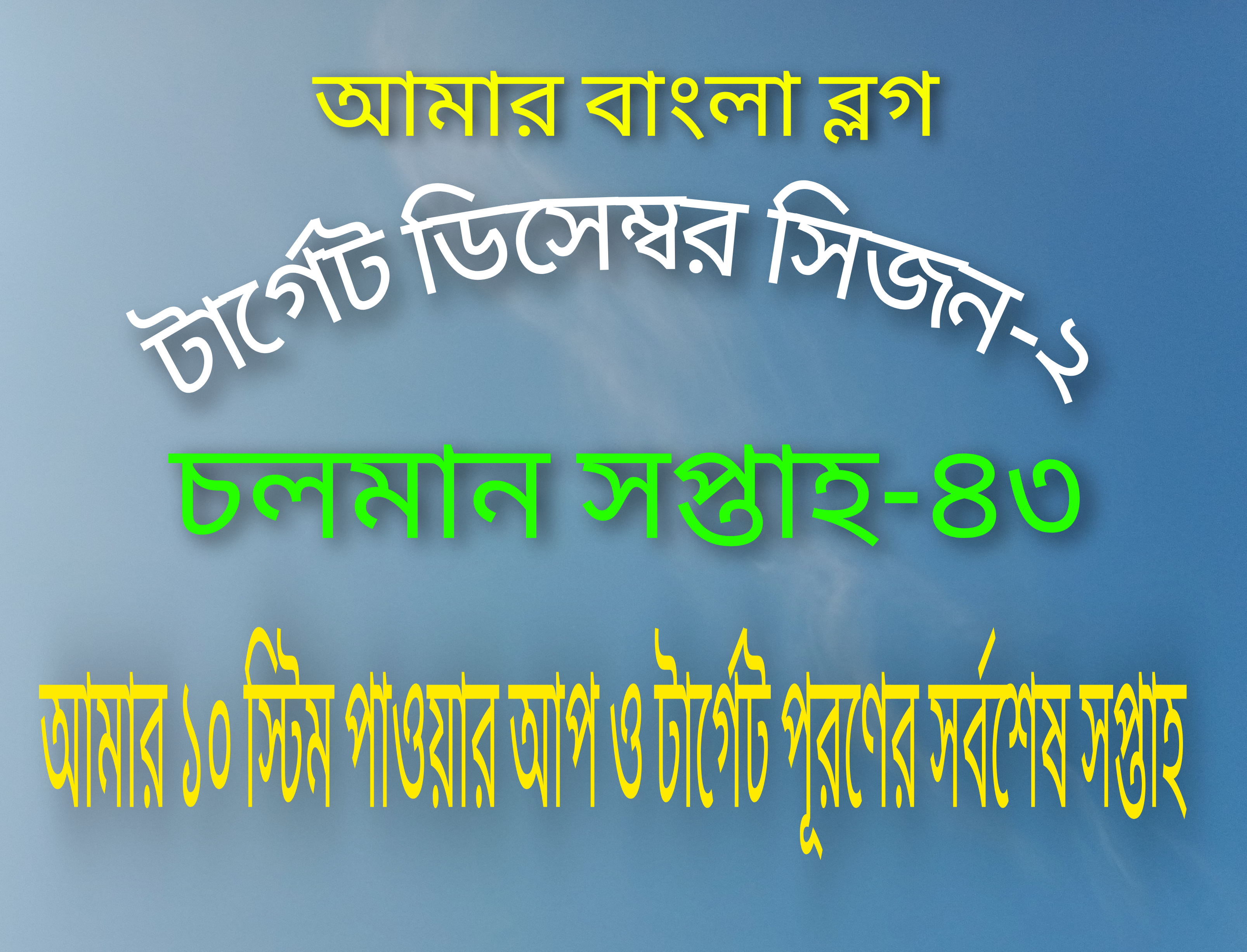 আমি @amitab বাংলাদেশ থেকে "আমার বাংলা ব্লগ" কমিউনিটির এপার বাংলা এবং ওপার বাংলার বাংলা ভাষাভাষী সকল বন্ধুদের জানাই আন্তরিক শুভেচ্ছা। আশারাখি সকলেই ভাল আছেন। আমি বিশেষ ভালো নেই, কারণ ঠান্ডা জনিত কারণে দুইদিন থেকে প্রচন্ড জ্বরে ভুগতেছি। ফলে ব্লগের কাজকর্ম ঠিকভাবে করতে পারছি না। যাইহোক, কোনরকমে আজ। "আমার বাংলা ব্লগ আয়োজিত" ডিসেম্বর সিজন-২, প্রতিযোগিতায় অংশগ্রহণ করে আজকের ১০ স্টিম করে পাওয়ার-আপর মাধ্যমে এটি হবে আমার টার্গেট পূরণের সর্বশেষ সপ্তাহ। আজ ও আমি প্রতিযোগিতার ৪৩ তম সপ্তাহে অংশগ্রহণ করে আমার ১০ স্টিম পাওয়ার-আপ সহ টার্গেটির সর্বশেষ সপ্তাহ সম্পাদন করছি।