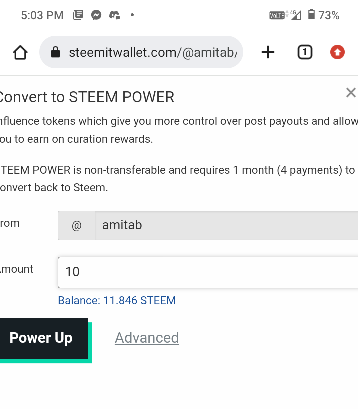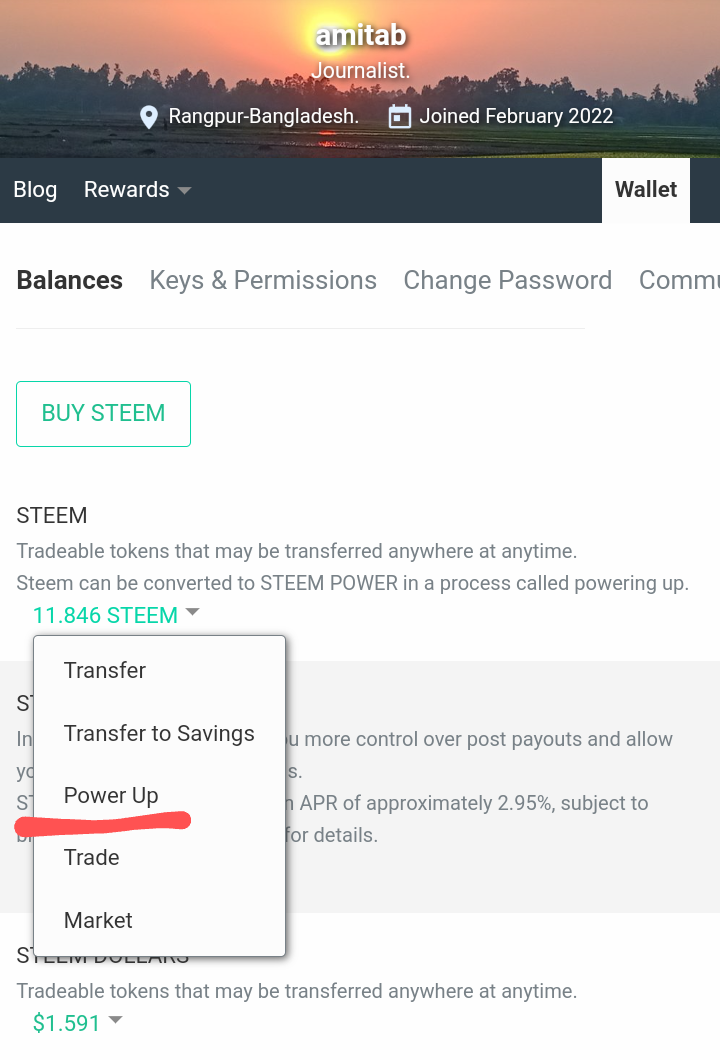 বর্তমানে আমার ওয়ালেটে স্টিম ব্যালেন্স রয়েছে=১১.৮৪৬ স্টিম এবং স্টিম পাওয়ার ব্যালেন্স রয়েছে=৬০৮.৫৯২স্টিম। এবার আমি পাওয়ার আপ করার জন্য স্টিম ব্যালেন্সের তীর চিহ্নতে ক্লিক করলাম। ক্লিক করার সঙ্গে সঙ্গেই পাওয়ার আপের একটি অপশন চলে আসলো।