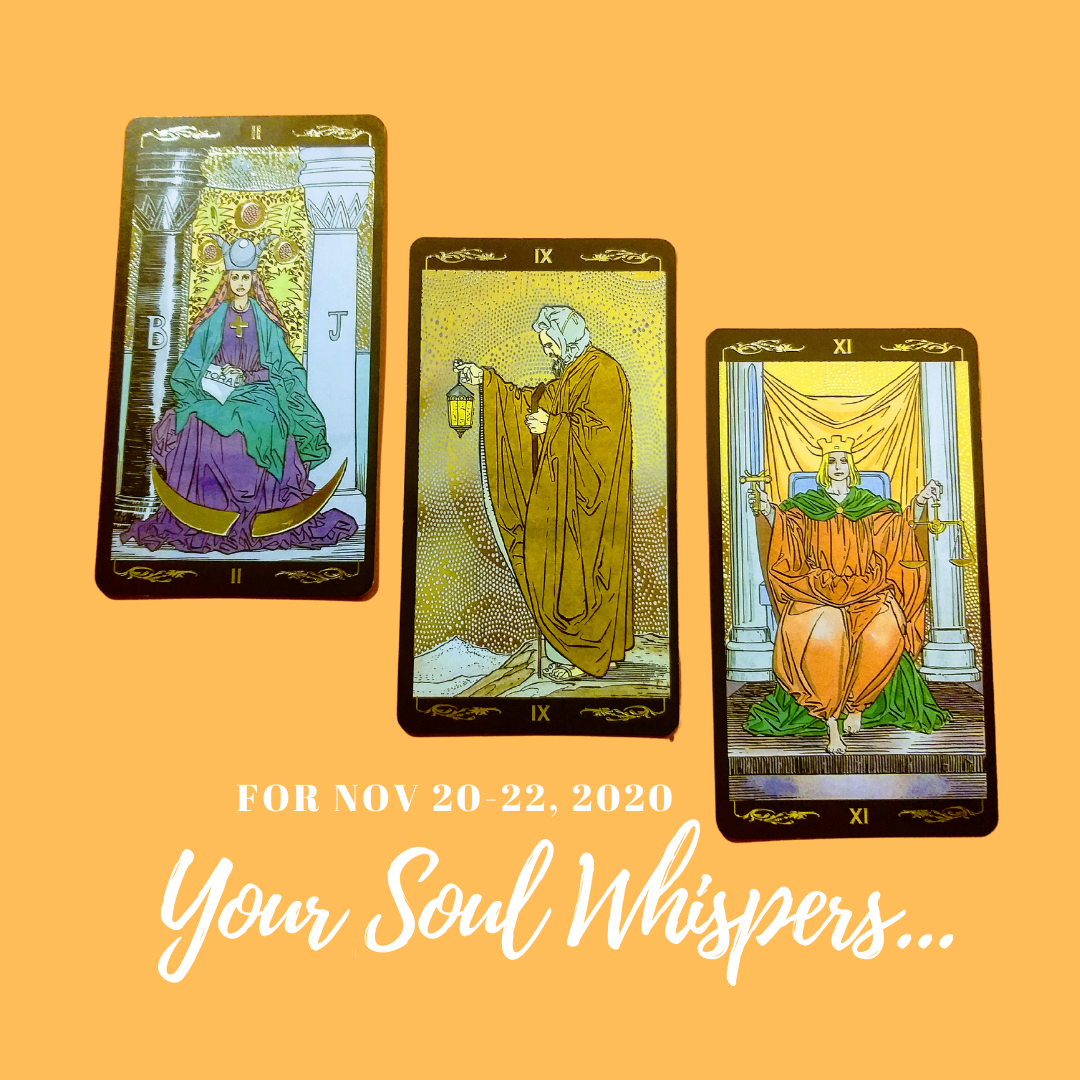 Continuing the theme from yesterday, this weekend is about going on the within and spending time getting to know yourself and your Inner Divine more deeply. As things move along in your outside world, these energies request you to stay inside of your world. There is a need to pay more attention to the whispers of your own soul than to the external chatter, in order to stay in balance, and keep your equilibrium (or regain it). 3 Major Arcana cards represent the Universe blowing a loud horn to say this is necessary, for your sake. The High Priestess | The Hermit | and Justice bring strong admonition to focus more within, and get closer to your Divine Self. They give you the opportunity to form a strategy for dealing with all the change going on everywhere, and help you become better acquainted with your True Self, your deeper layers, and with the voice of your intuition, your own personal radar which guides you. Such an alignment forwards your personal and spiritual growth, and keeps things balanced on the inside of you, and fair for you in your external world dealings.