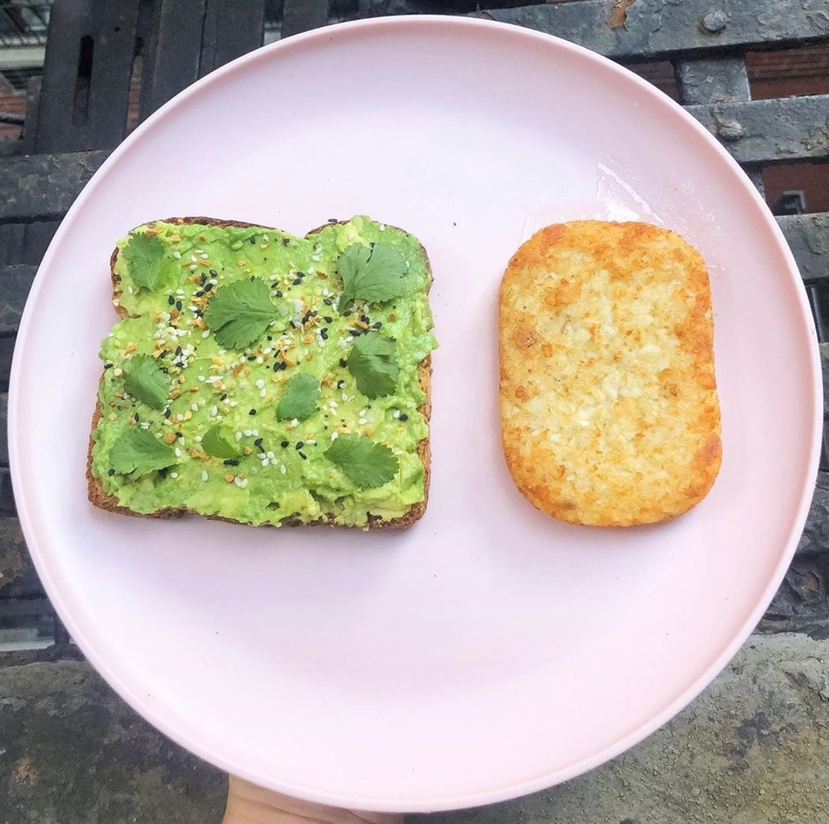 First up, toast the bread as much or as little as you like. In a bowl, mash up the avocado with a fork and add in a squeeze of lemon or lime and some garlic powder. Once mashed, spread the avocado mixture evenly over the toast and top with everything bagel seasoning, cilantro, and some hot sauce. Sometimes I like to even pair my toast with a hashbrown for an extra treat!