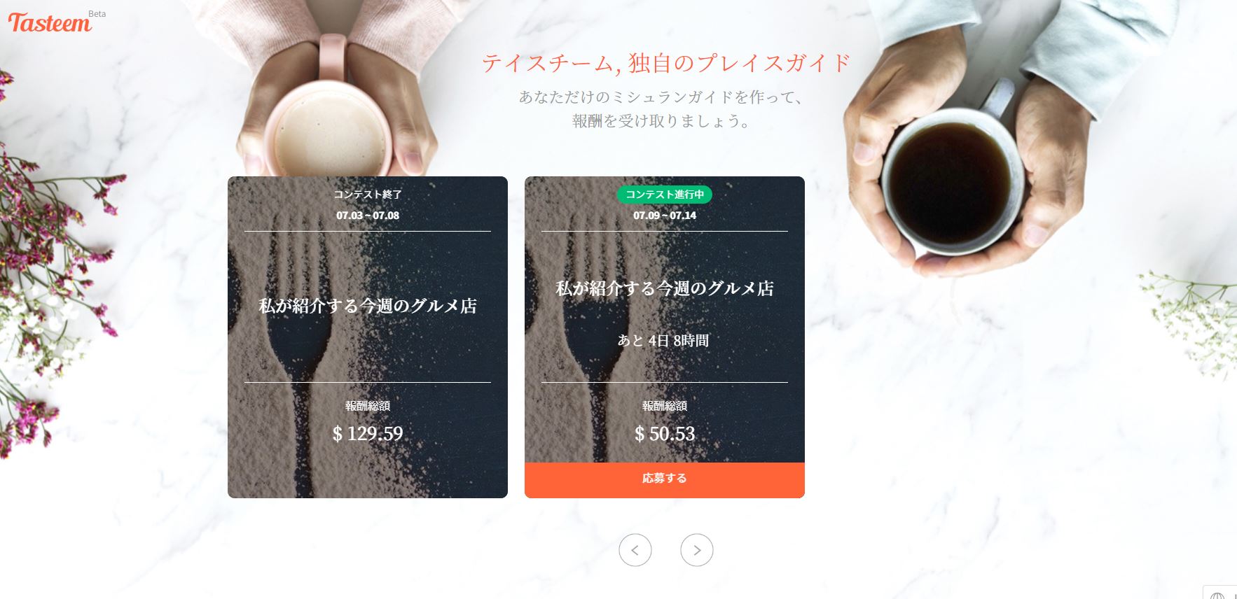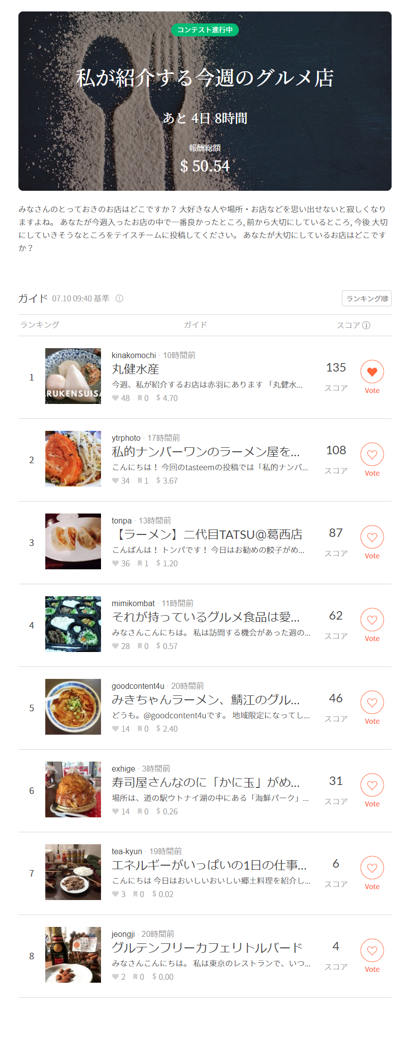 Tasteemのコンテストに参加して記事を書いてくださるユーザー様は自動的にコンテストに応募されグルメガイド投票システムにより順位を競い合います。多くの支持をもらっているユーザー様にはVote以外に順位に応じて賞金を受け取る事ができます。