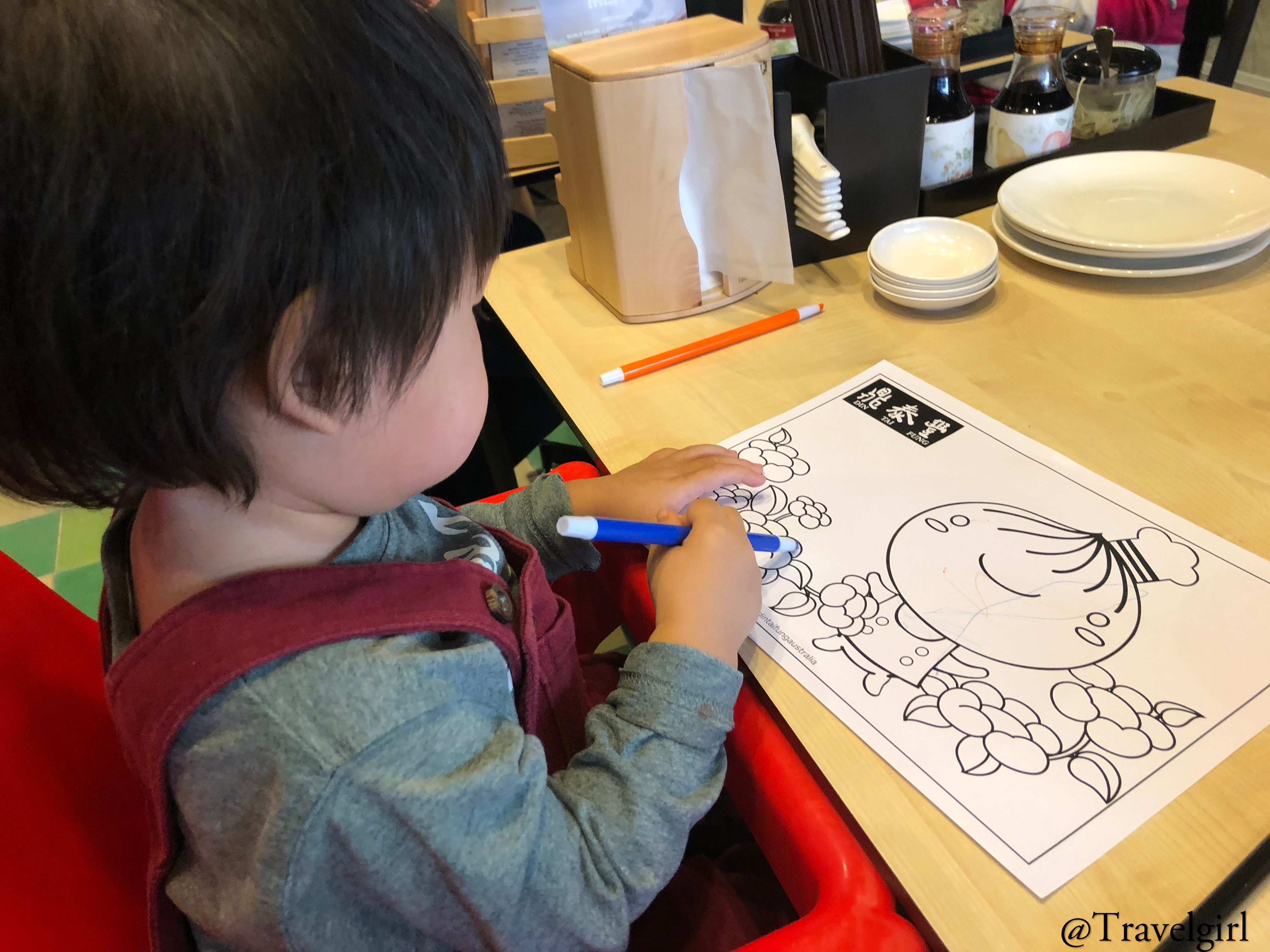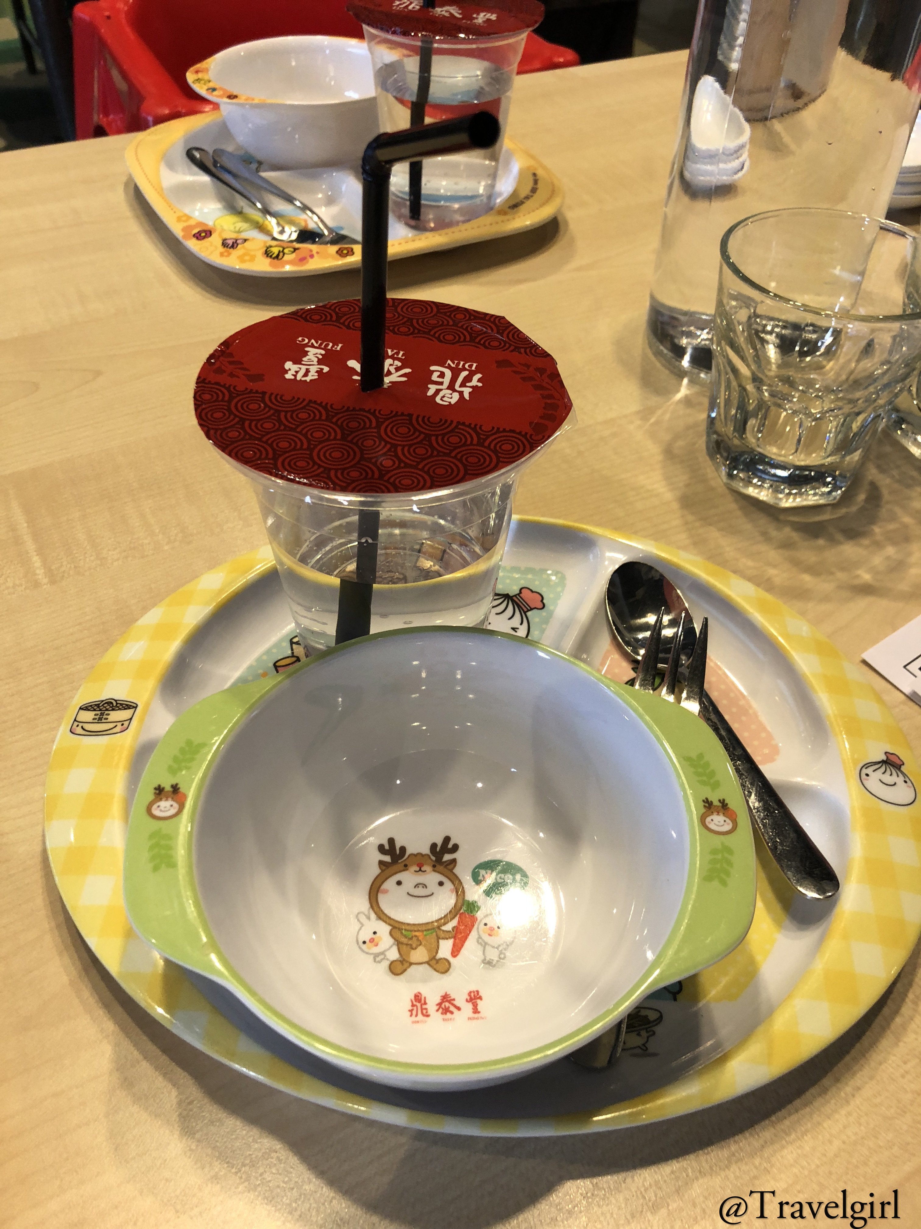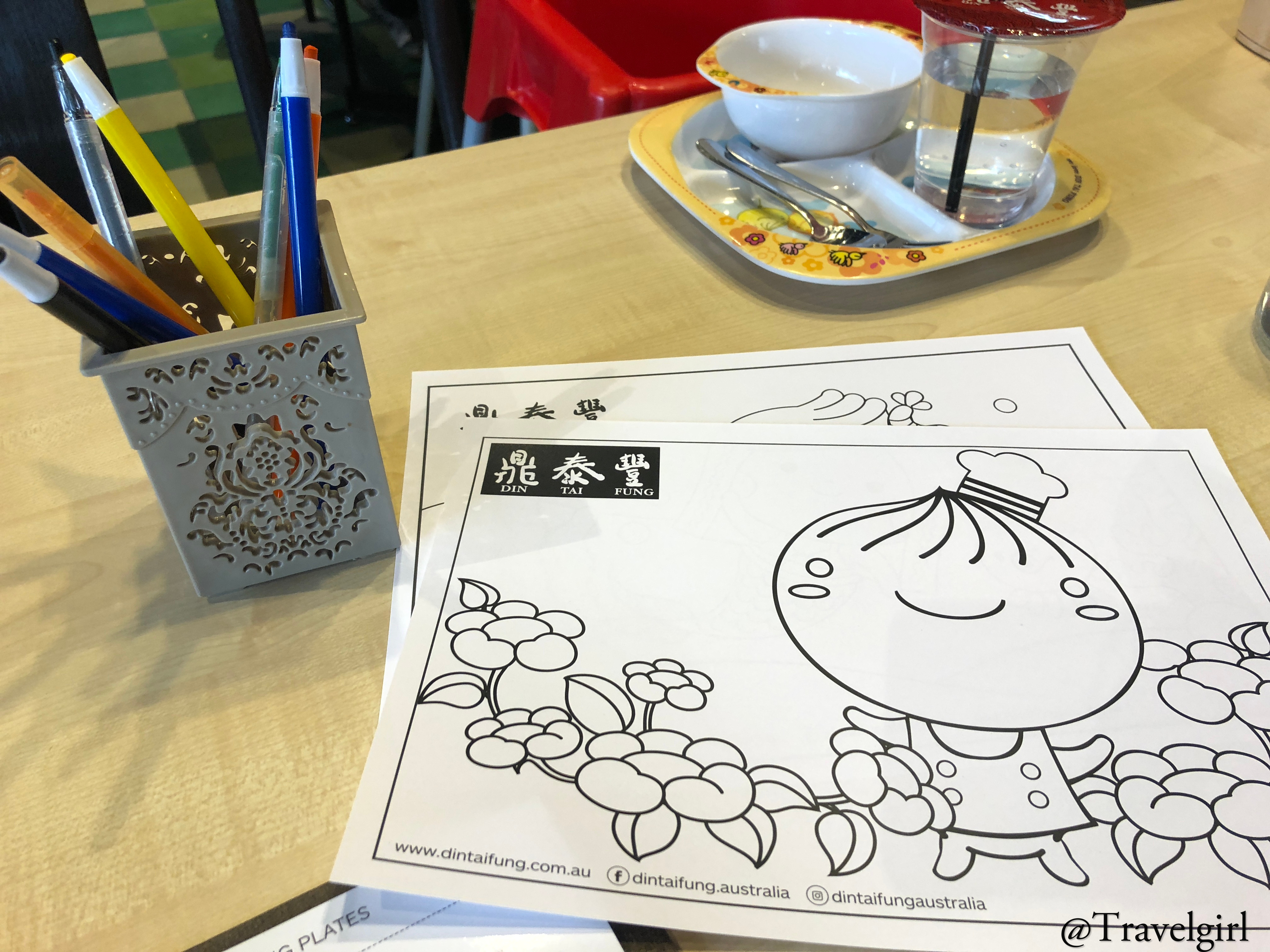 As we were deciding what to order, the waitress bought out two sets of kids cutlery and an activity set for them. The kid's cutlet set has the Ding Tai Fung mascots printed on them and a cup of sealed water also provided which is perfect for kids in case they spill water. The activity set was different printed pictures for kids to colour in which keeps them occupied. Check out some of the finished artwork from kids - I guess many of them do love colouring in.